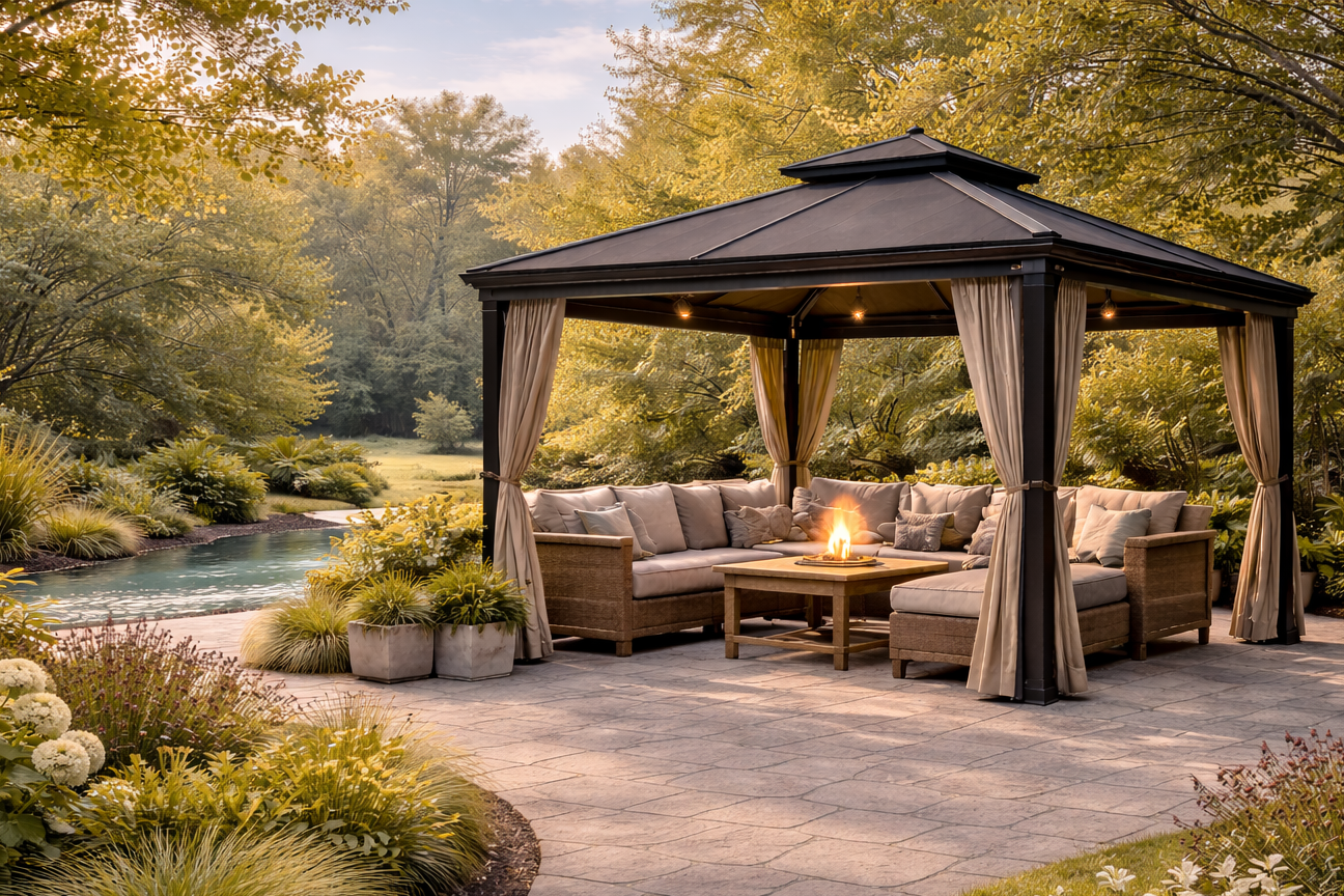 Gazebo 10' x 12' à toit rigide avec double toit en métal, moustiquaire et crochet, gris clair