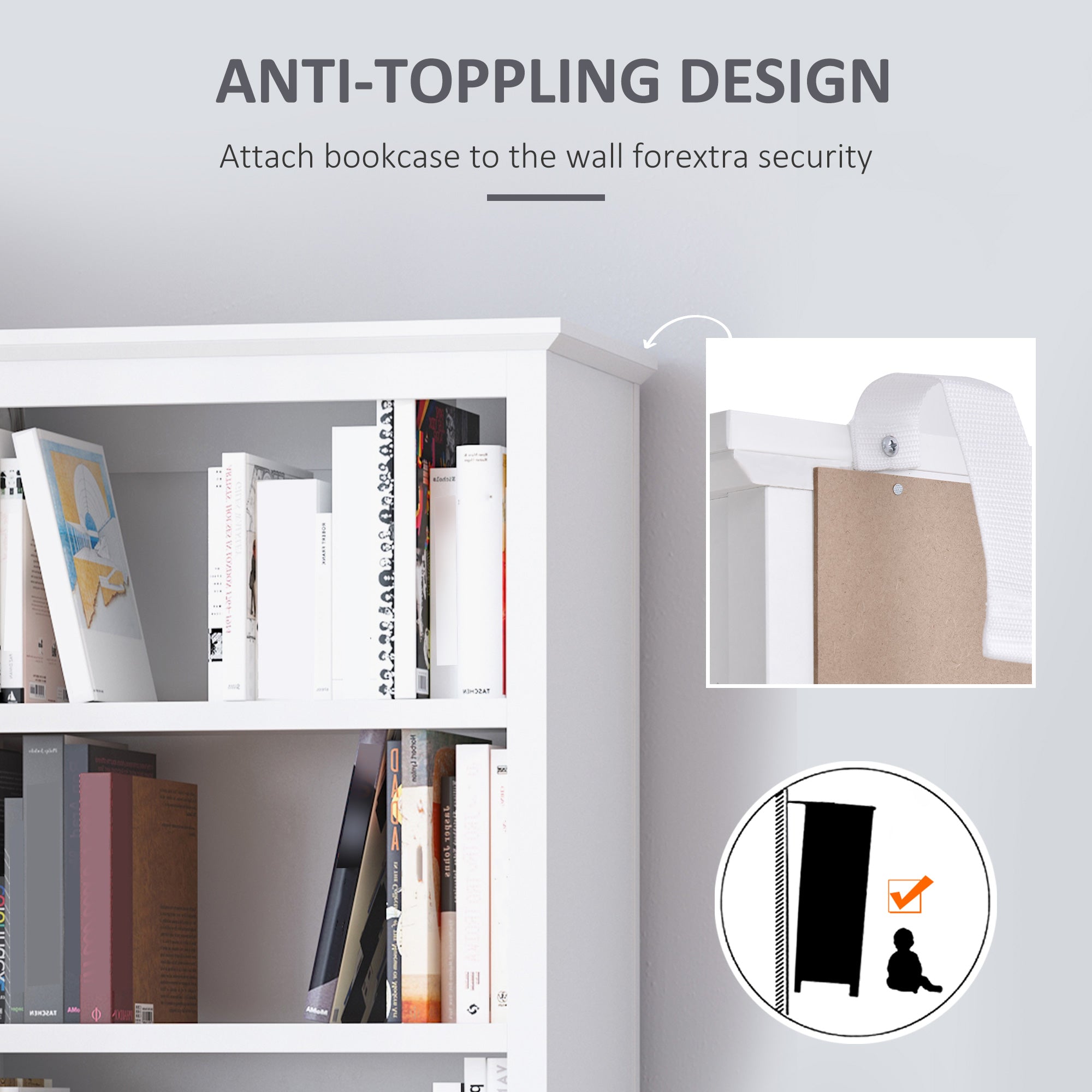 Durable et stable : La vitrine est principalement composée de MDF de qualité P2 et de panneaux de particules pour une utilisation durable. Pour une stabilité accrue, l’arrière est équipé d’un dispositif anti-basculement.