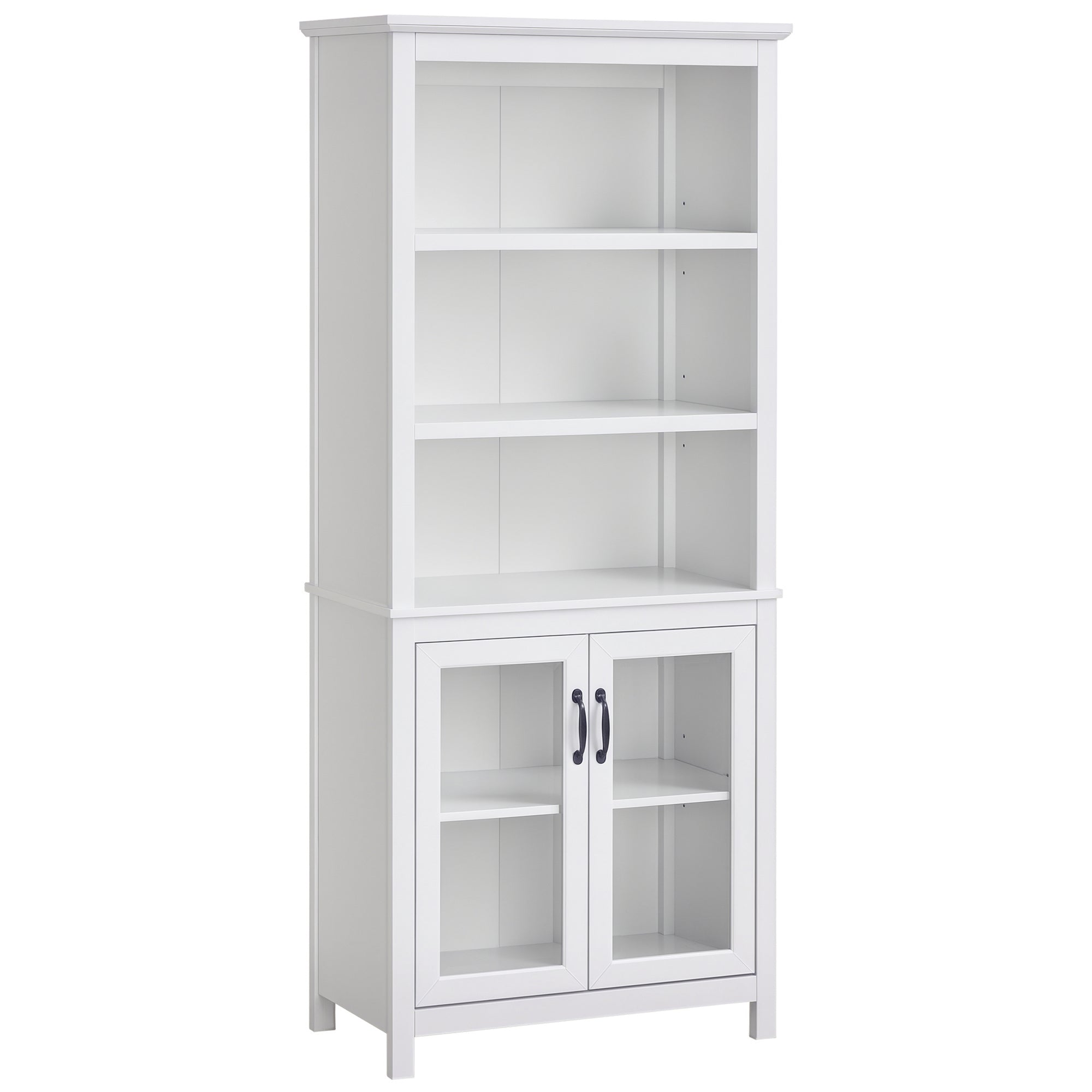 Étagère à 3 niveaux avec placard : Les trois étagères ouvertes de la bibliothèque haute optimisent l’espace de rangement vertical, tandis qu’une armoire vitrée protège vos affaires de la poussière.