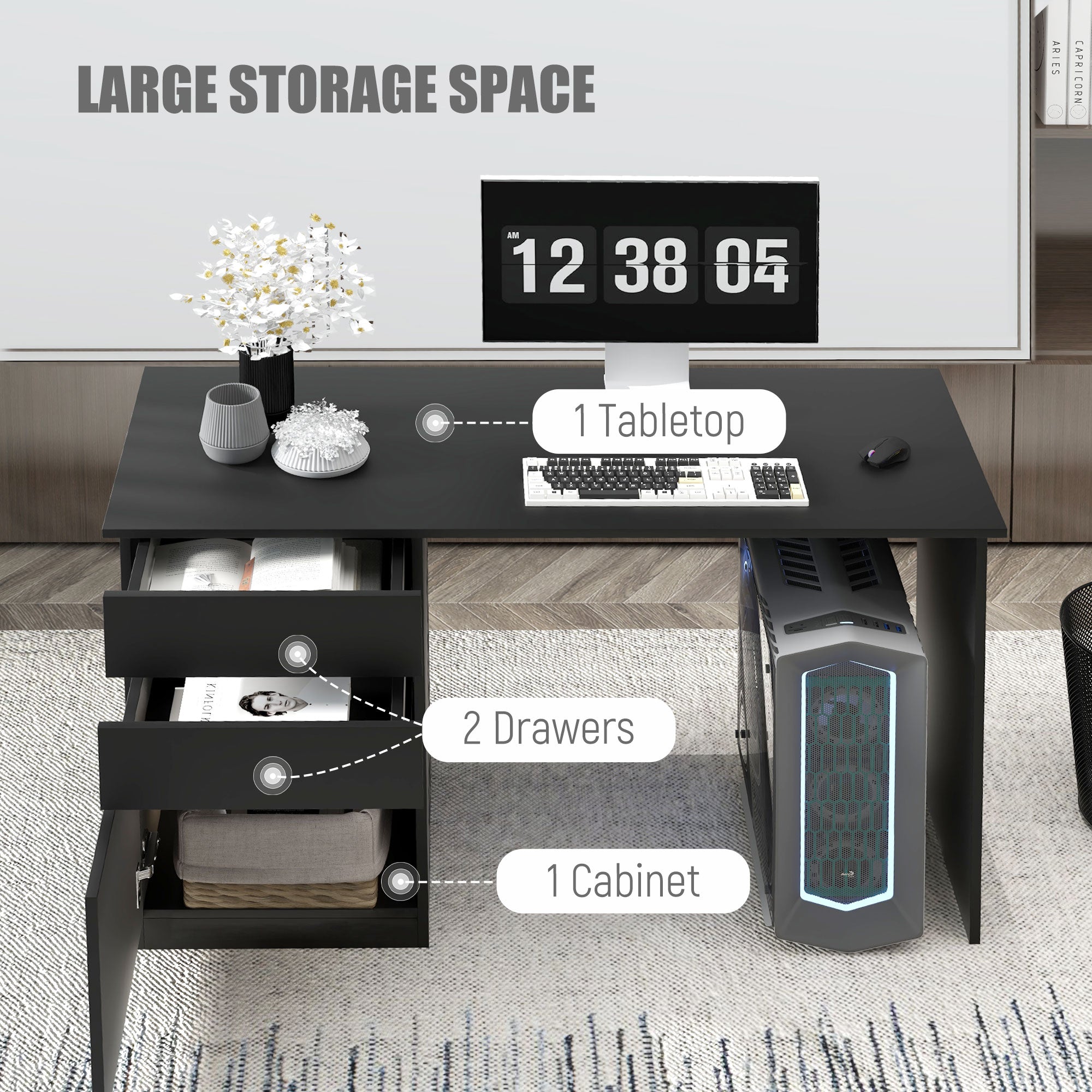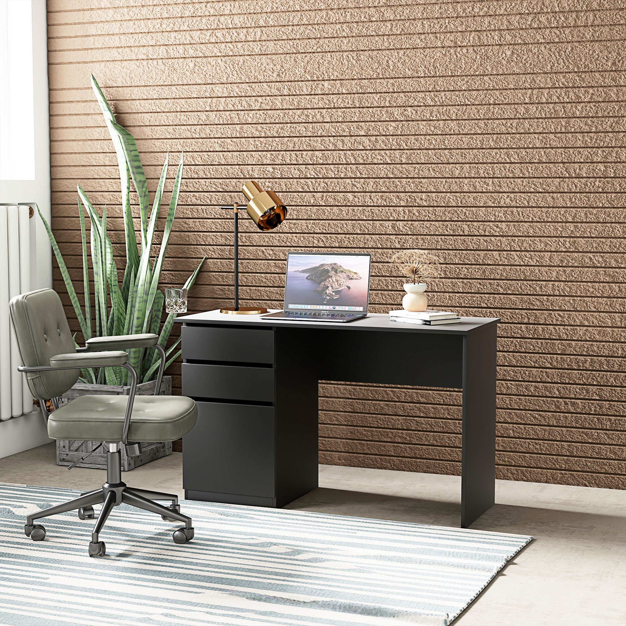 Doté d’un large plateau, ce bureau de travail offre amplement d’espace pour accueillir votre ordinateur, imprimante et accessoires. Ses deux tiroirs et un caisson fermé permettent de garder vos fournitures bien organisées et à portée de main. -