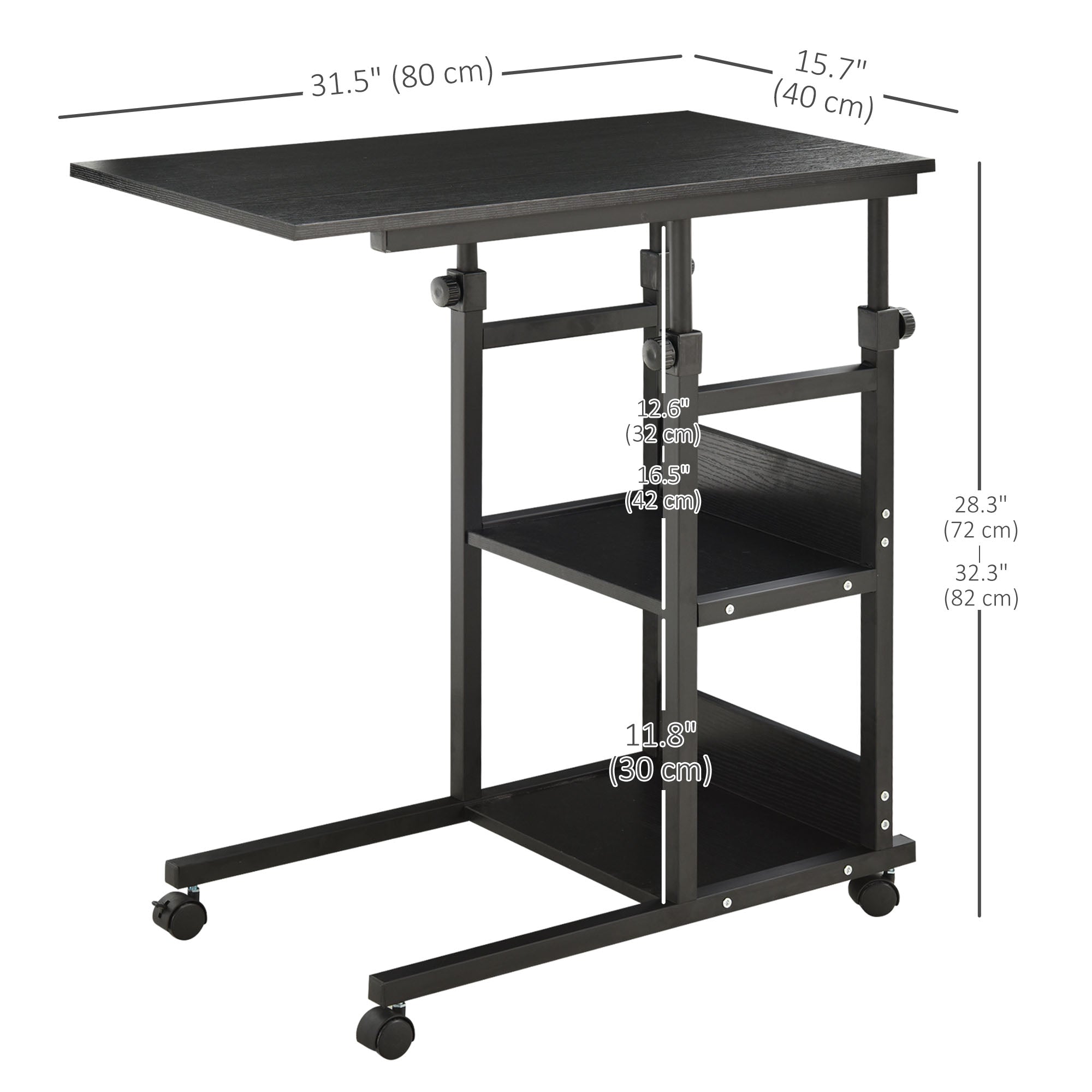 Table d’appoint mobile noire en forme de C avec roulettes et étagères de rangement