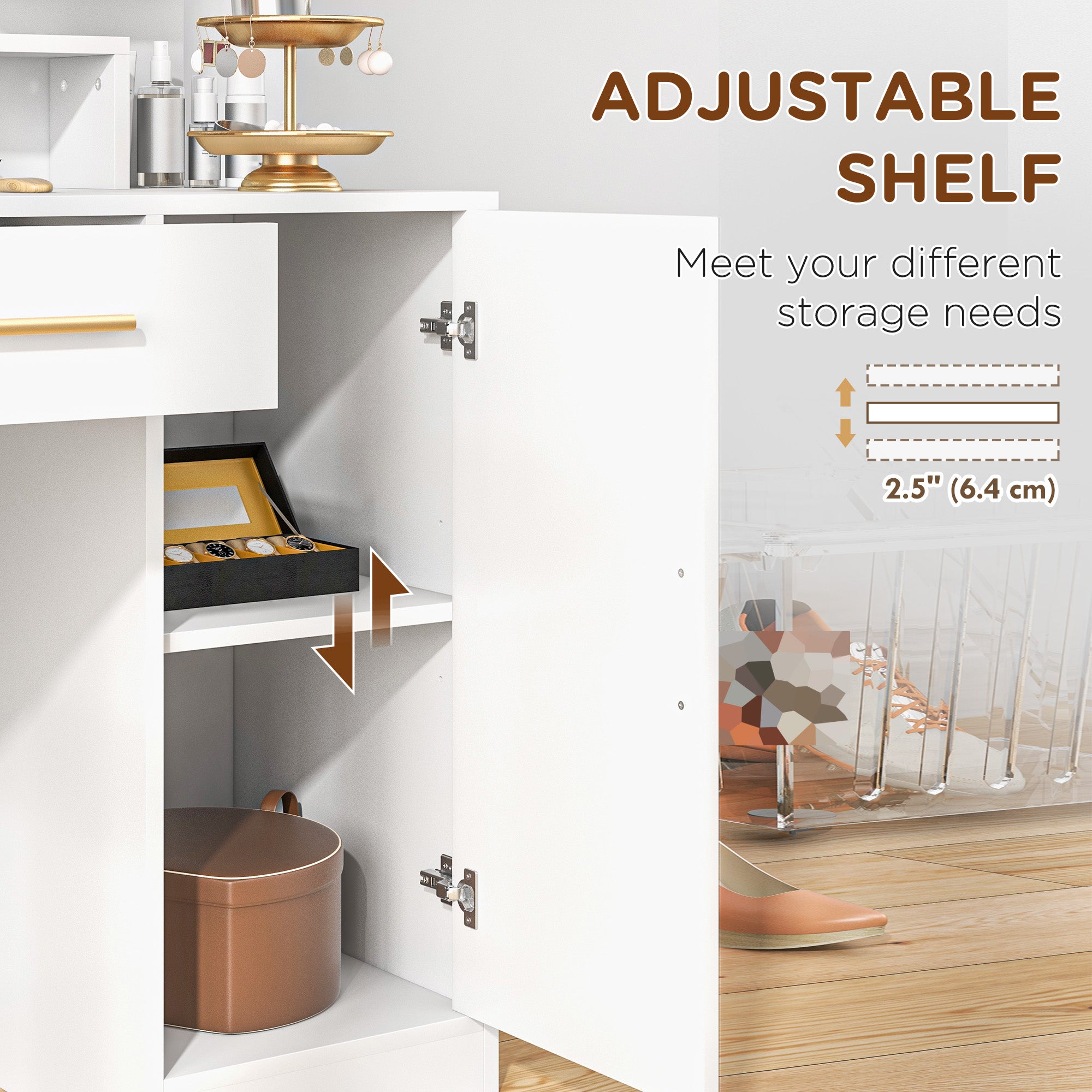 Organisation pratique et design intelligent : un tiroir spacieux, une armoire à portes avec étagères réglables et trois étagères ouvertes permettent de ranger vos produits de beauté, accessoires et bijoux en toute simplicité. Chaque espace est pensé pour offrir une organisation optimale tout en gardant un design harmonieux.