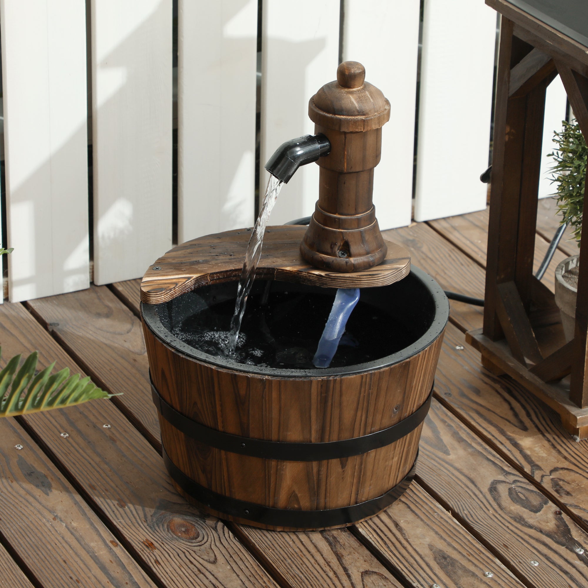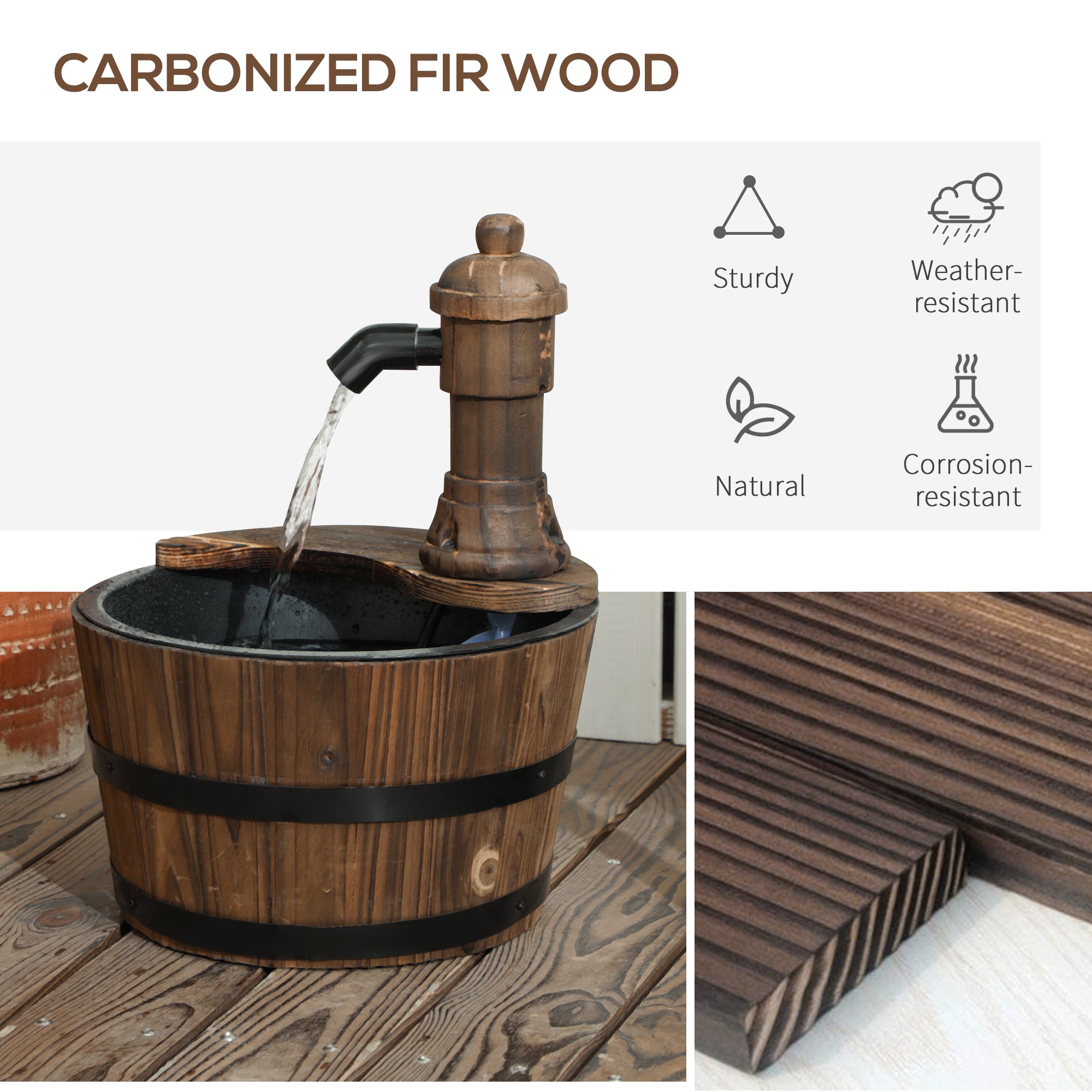 - Construction en bois de sapin massif : Fabriquées à partir de bois de sapin et traitées avec une finition carbonisée, nos fontaines de jardin sont conçues pour résister à toutes les conditions météorologiques pour des performances durables.