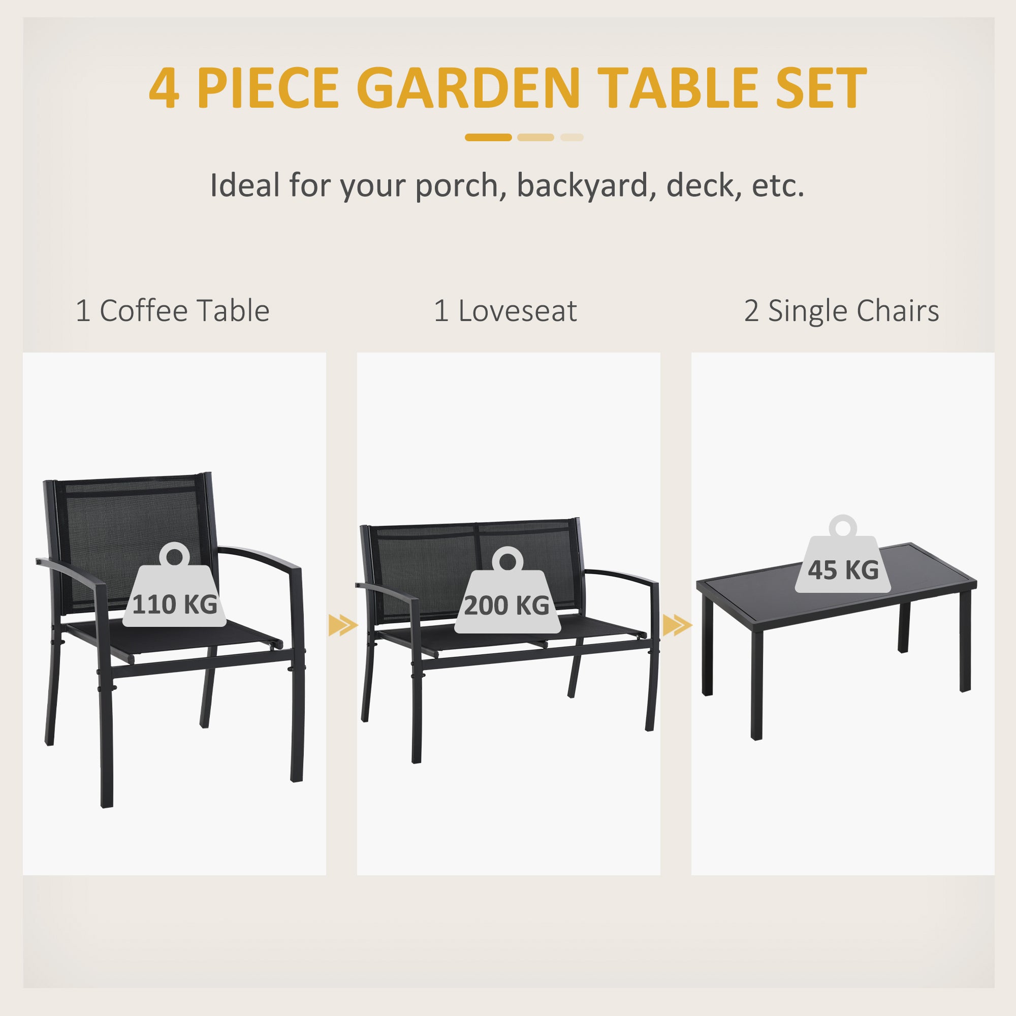 - Ensemble de meubles de patio quatre pièces : Idéal pour tout espace extérieur, cet ensemble élégant comprend une causeuse, deux fauteuils individuels et une élégante table basse rectangulaire avec une surface en verre noir