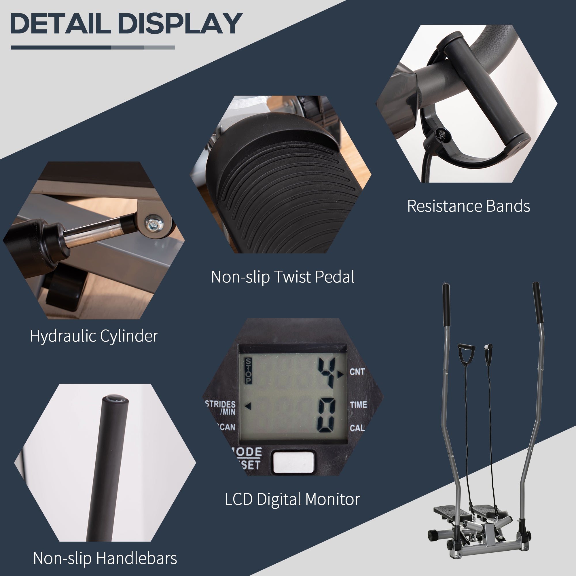 Exercice global : Ce stepper avec guidon réglable offre un entraînement complet du corps, sollicitant mollets, cuisses, hanches et fessiers tout en engageant le haut du corps grâce à ses poignées mobiles.