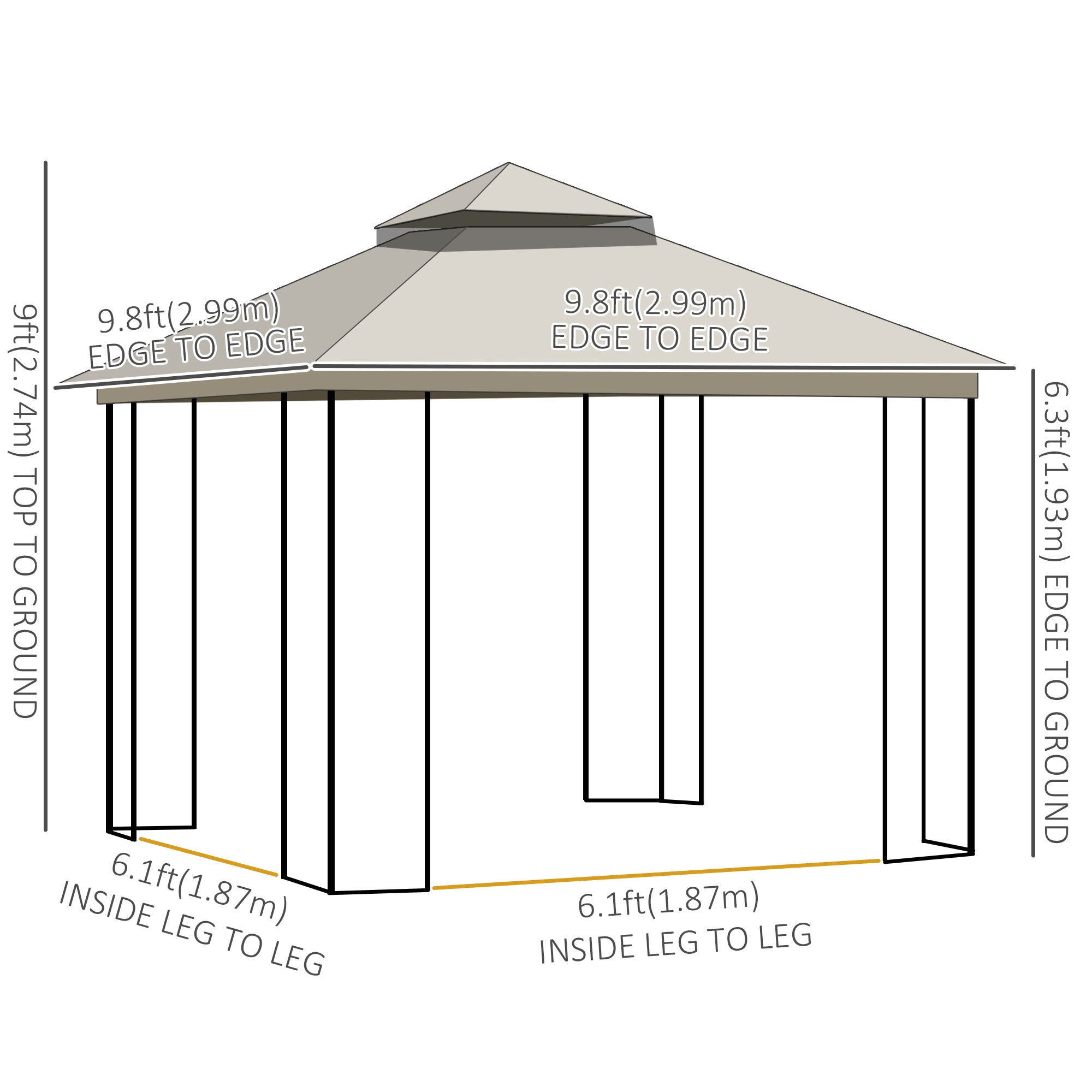 - Dimensions de l'auvent du gazebo : Dimensions hors tout : 9,8 pi L x 9,8 pi l x 9 pi H (299 x 299 x 274 cm), hauteur de l'avant-toit : 6,3 pi (193 cm). Assemblage requis.