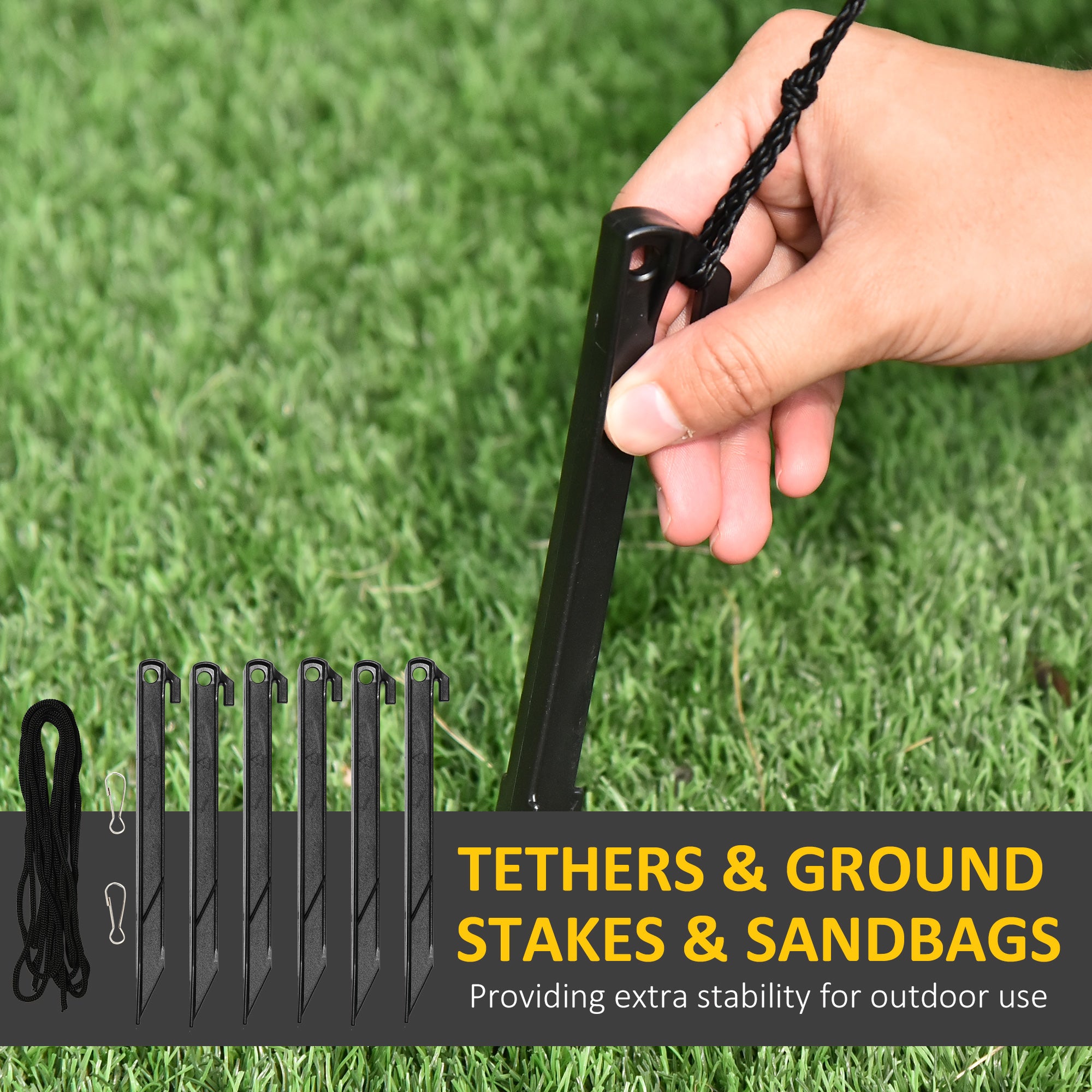 - Accessoires inclus : 6 piquets, 2 cordes, 3 sacs de sable, ventilateur interne, manuel