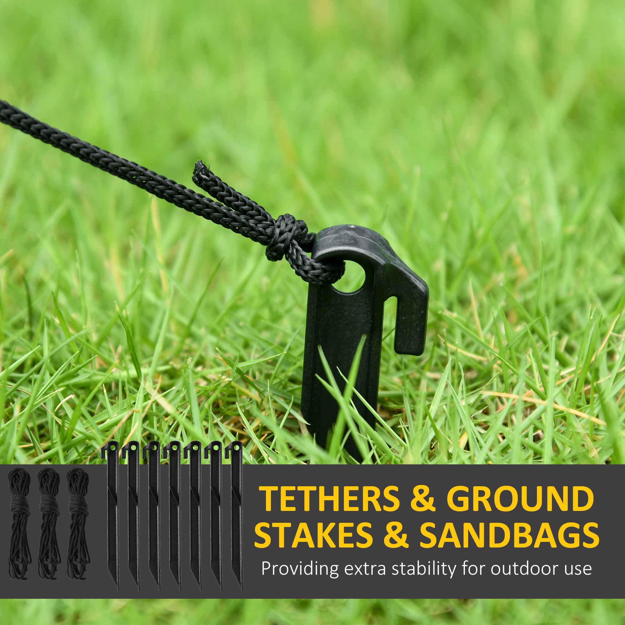 Robuste et sécurisé : Conçu en tissu polyester imperméable certifié IP44, il résiste aux intempéries. Inclus : piquets, cordes et sacs de sable pour le maintenir fermement en place, même les soirs venteux.