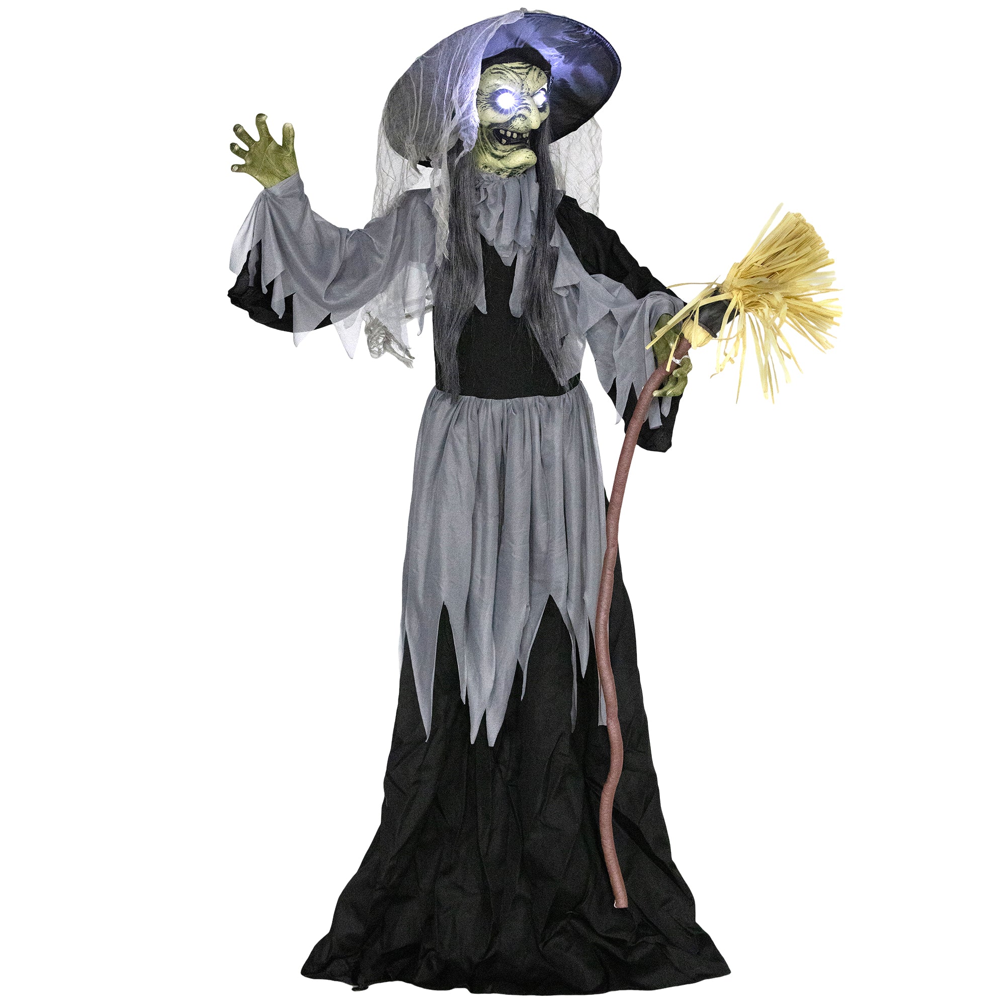 Grande taille réaliste : Avec ses 183 cm de hauteur, cette sorcière animée devient un point central de votre décor d’Halloween, idéale pour les maisons, fêtes costumées et espaces publics couverts.