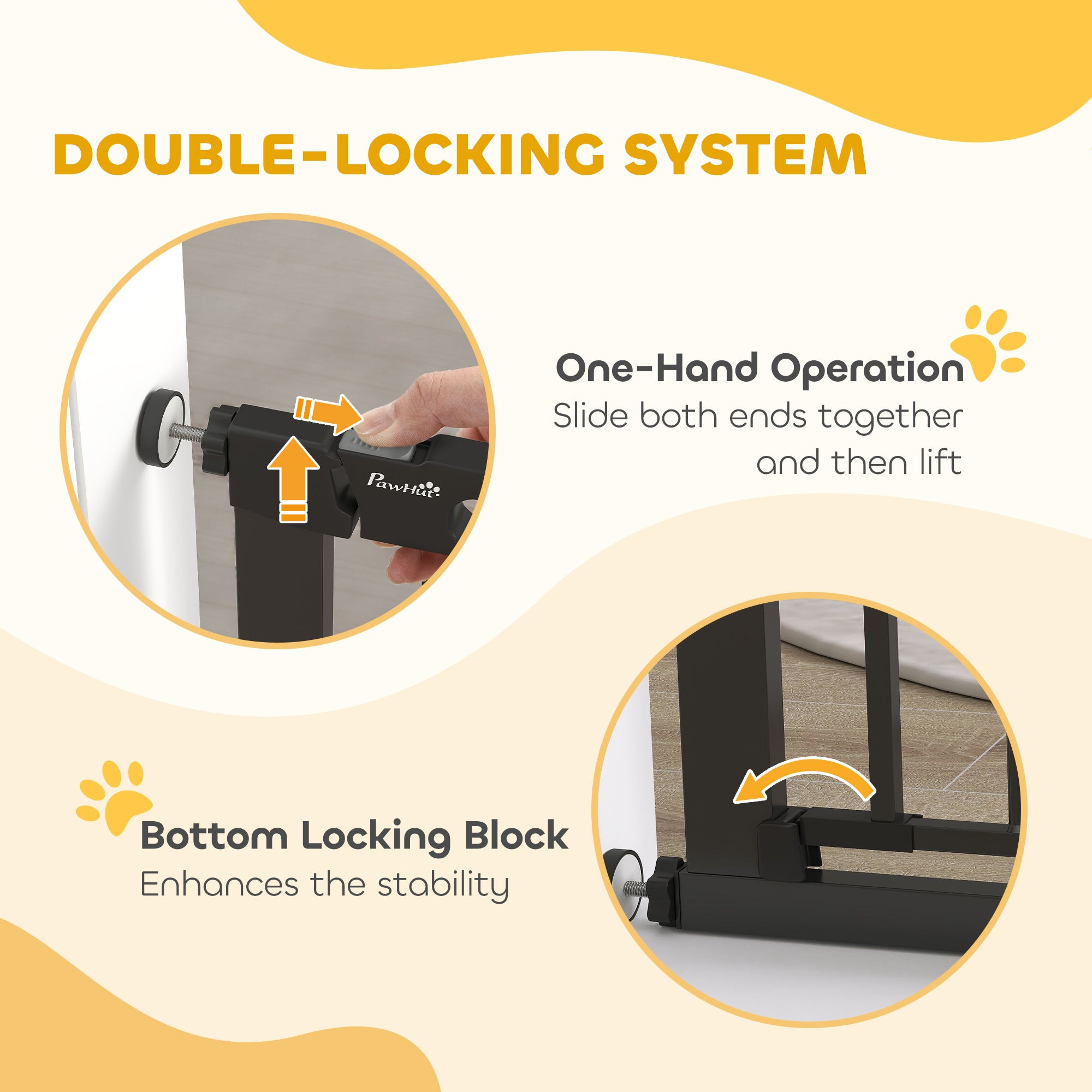 - Système de double verrouillage : un adulte peut ouvrir la porte d'une seule main en faisant glisser le bouton situé sur le dessus (il faut faire glisser les deux extrémités simultanément, puis soulever). La barrière pour chien est dotée d'un bloc de verrouillage inférieur pour une meilleure stabilité et la sécurité de l'animal.