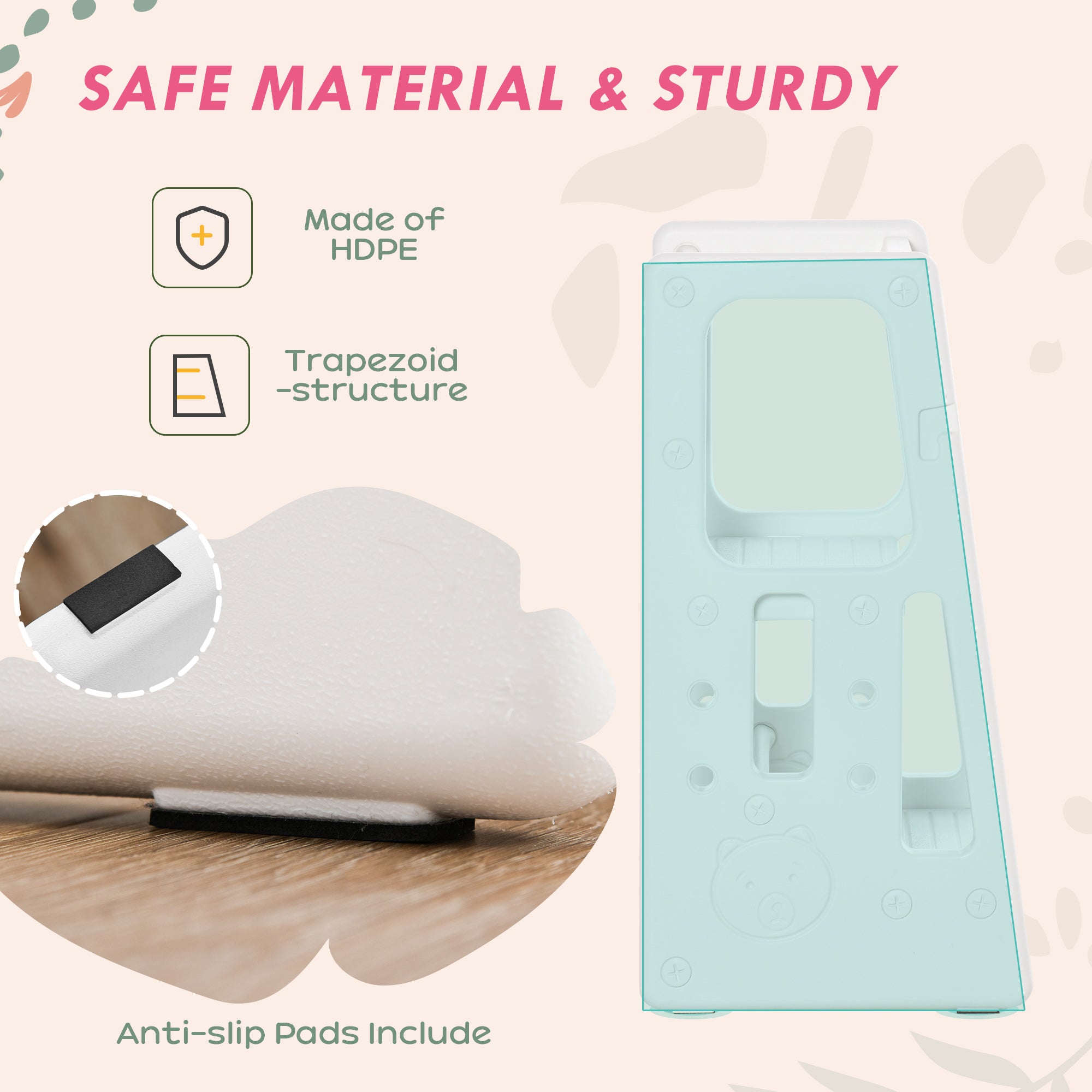 Stabilité et sécurité Sa structure trapézoïdale assure un excellent équilibre, tandis que le tapis antidérapant évite les glissades. Solide et fiable, il supporte jusqu’à 65 kg.