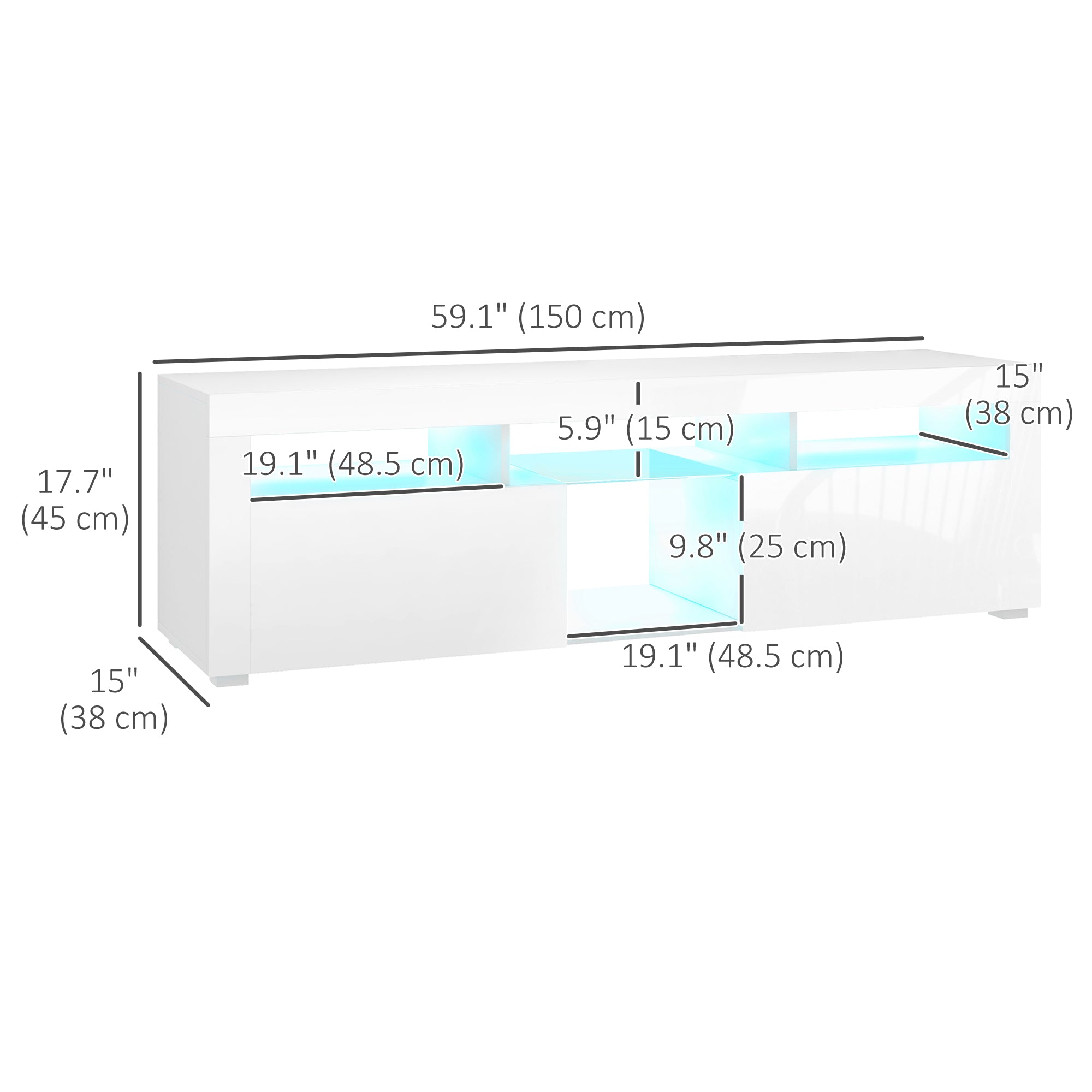 - Dimensions hors tout : 59,1" L x 15" P x 17,7" H (150 x 38 x 45 cm)