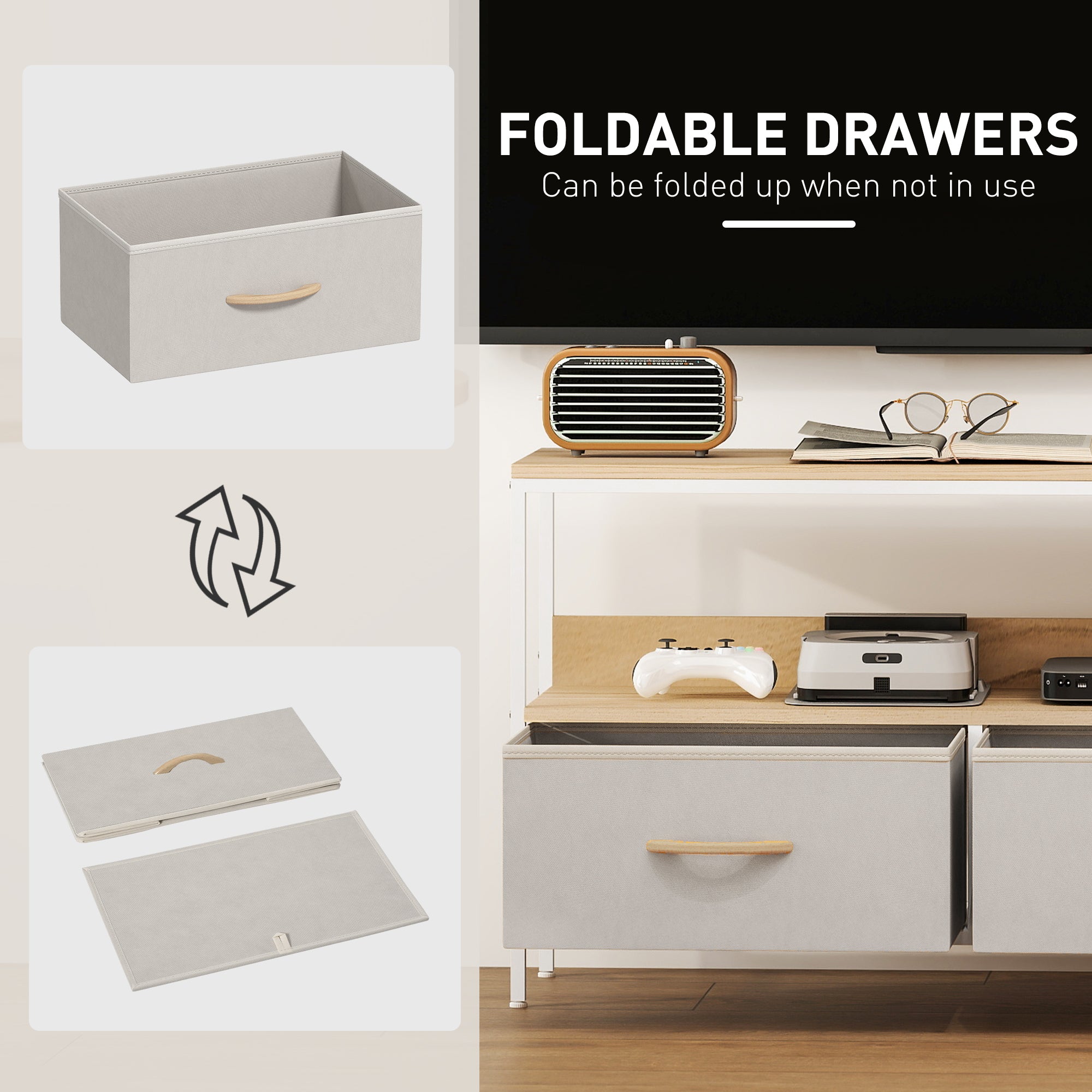 Rangement intelligent : le plateau peut accueillir un téléviseur jusqu’à 47 pouces, tandis que l’étagère ouverte centrale est idéale pour vos consoles, lecteurs ou télécommandes. Les deux tiroirs pliables ajoutent un espace de rangement astucieux et discret pour vos accessoires multimédia.