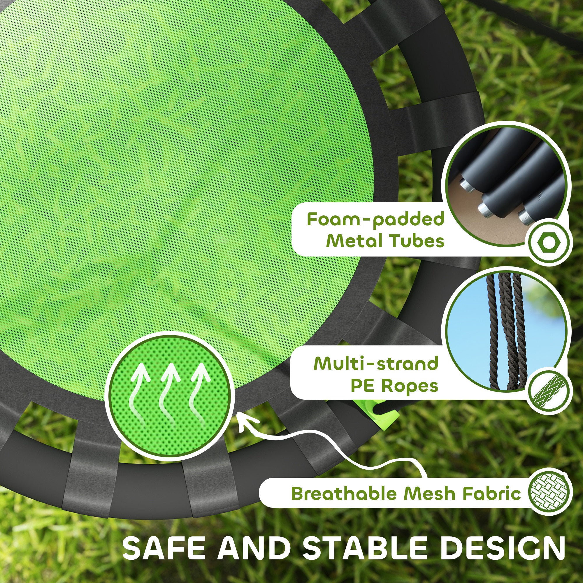 Sécurité renforcée : Les tubes métalliques sont recouverts d’une mousse protectrice empêchant la rouille et les chocs. Les cordes PE tressées multibrins assurent une suspension stable et solide pour un jeu en toute tranquillité.