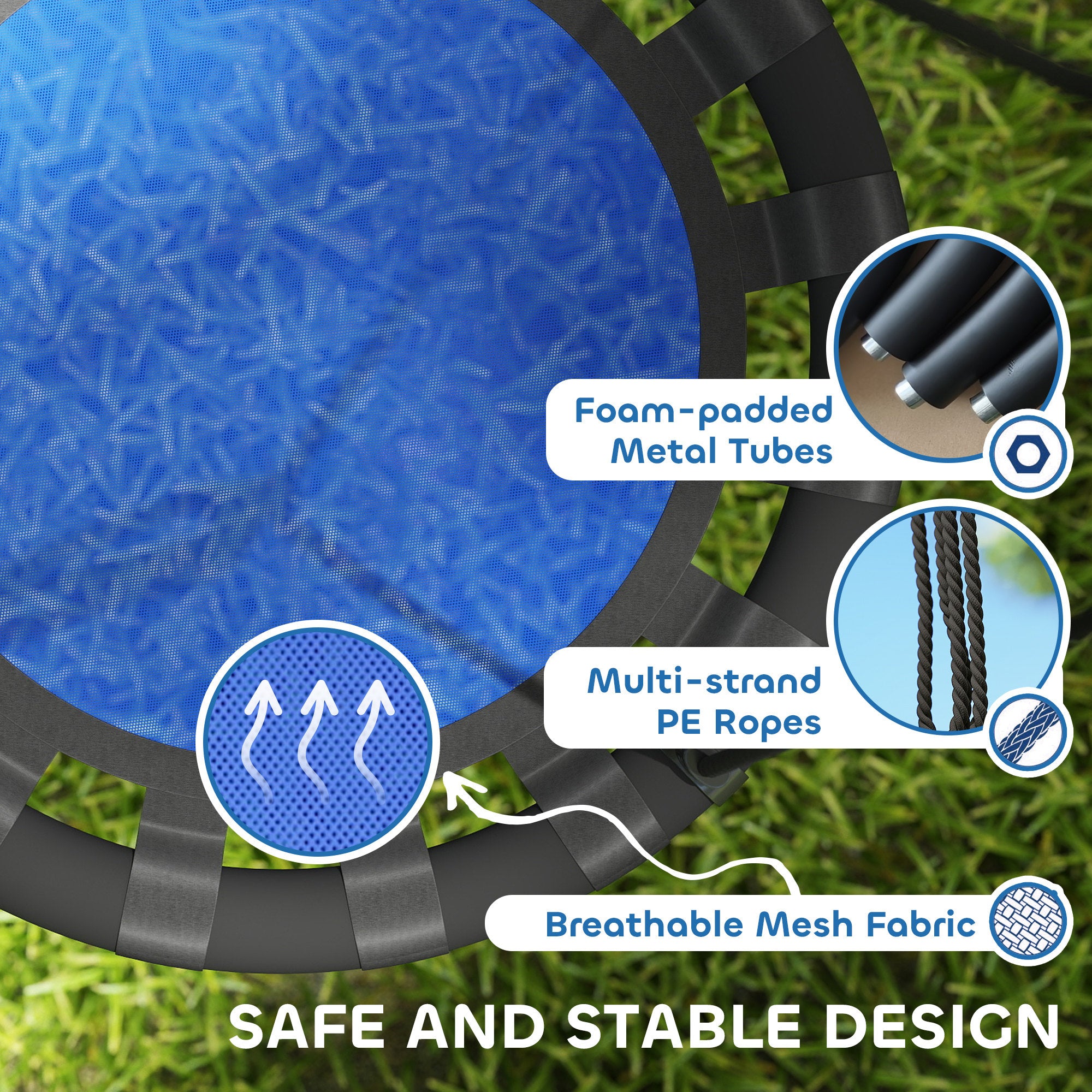 Sécurité renforcée : Les tubes métalliques sont recouverts d’une mousse protectrice empêchant la rouille et les chocs. Les cordes PE tressées multibrins assurent une suspension stable et solide pour un jeu en toute tranquillité.