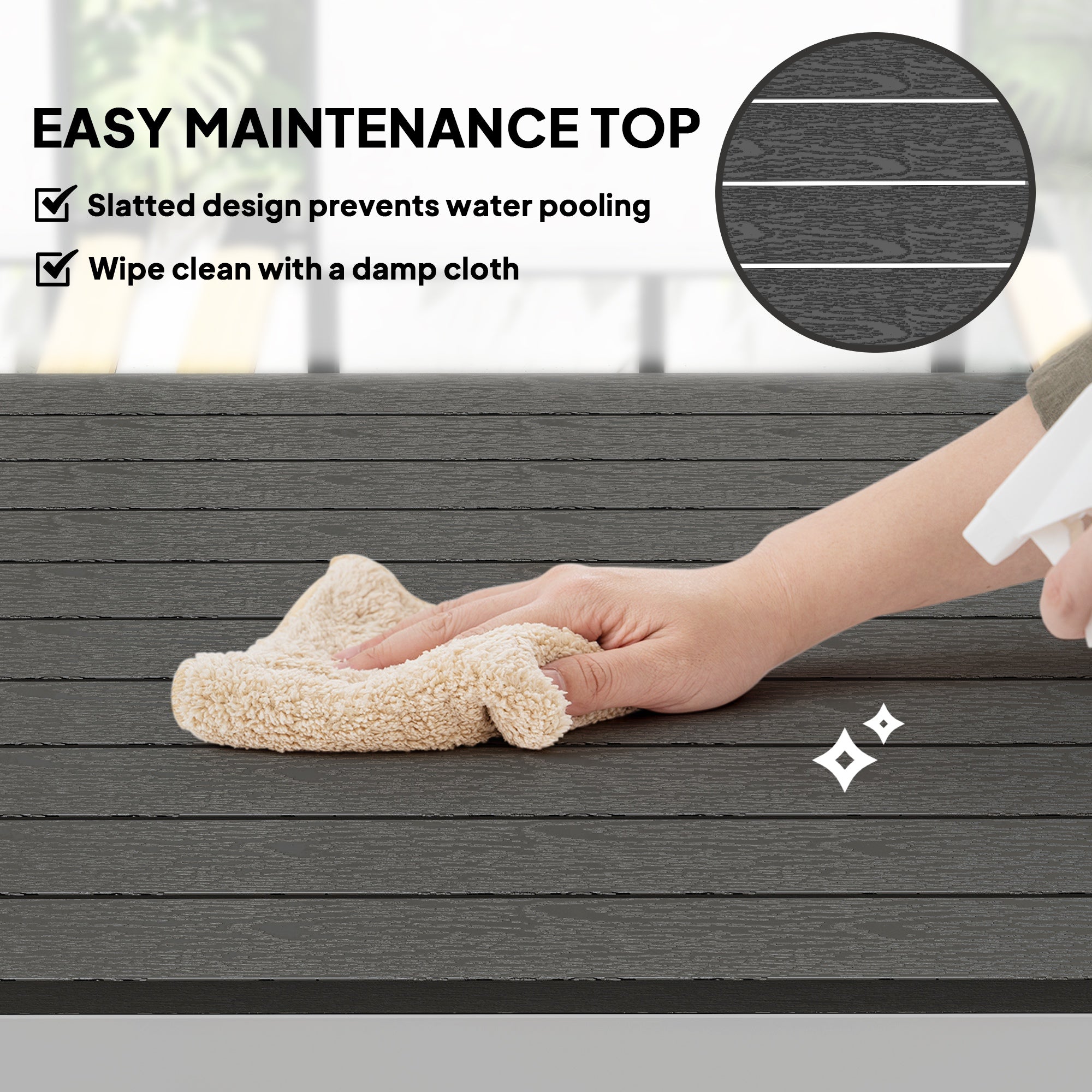 - Dessus facile d'entretien : Fabriquée en PS, la conception à lattes de cette table de patio extérieure permet un nettoyage facile et garantit que l'eau ne s'accumule pas, maintenant une surface propre et hygiénique pour toutes vos occasions de repas en plein air.