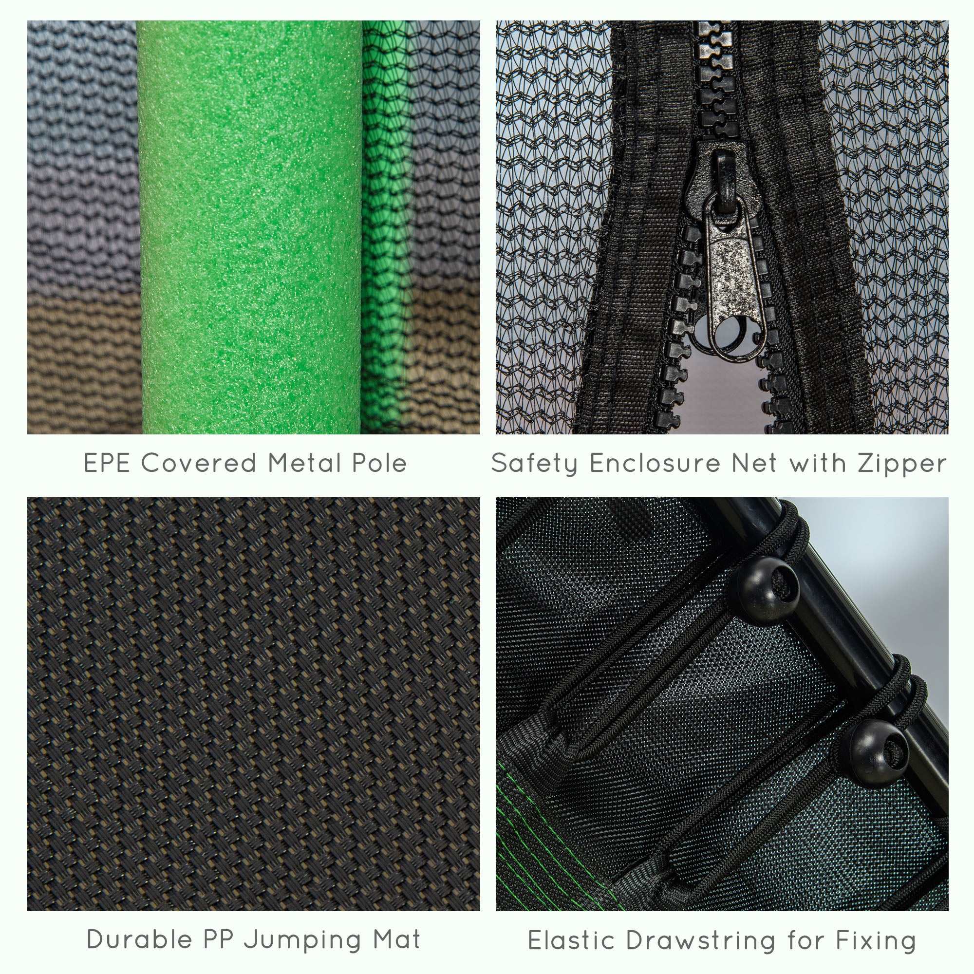 - Utilisation en toute sécurité : Comprend une enceinte de sécurité souple mais solide fixée directement au tapis de saut avec des poteaux épais et rembourrés pour empêcher votre enfant de tomber et de se blesser.