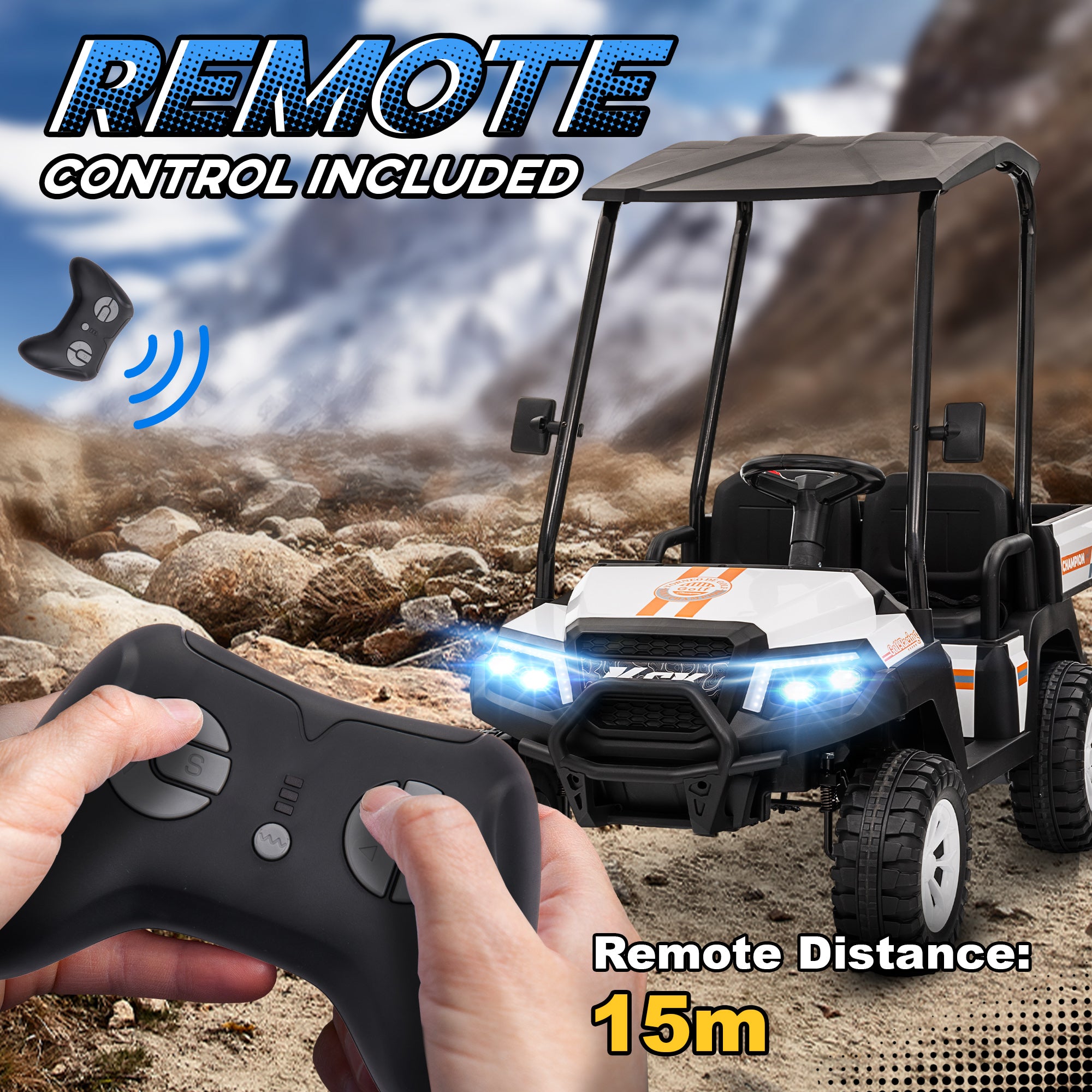 - Des fonctionnalités amusantes à profusion : cette voiture électrique dispose d'une capacité de deux places, d'un pare-soleil pour le confort, d'un espace de rangement arrière, de musique, d'un klaxon et de six lumières pour une expérience de jeu immersive.