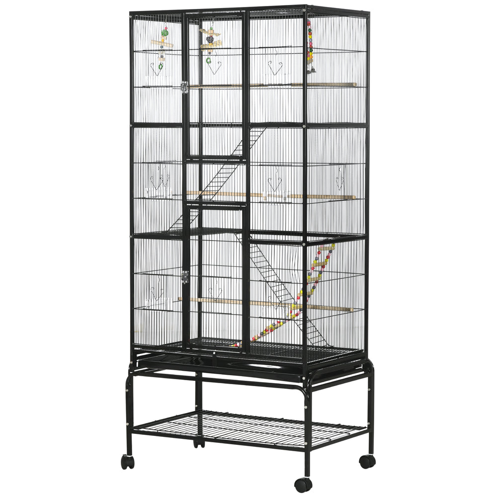 Bird Cage with Wheels, Perches, Ramp, Storage Shelf, Toys for Canaries, Finches, Cockatiels and Parakeets, Black