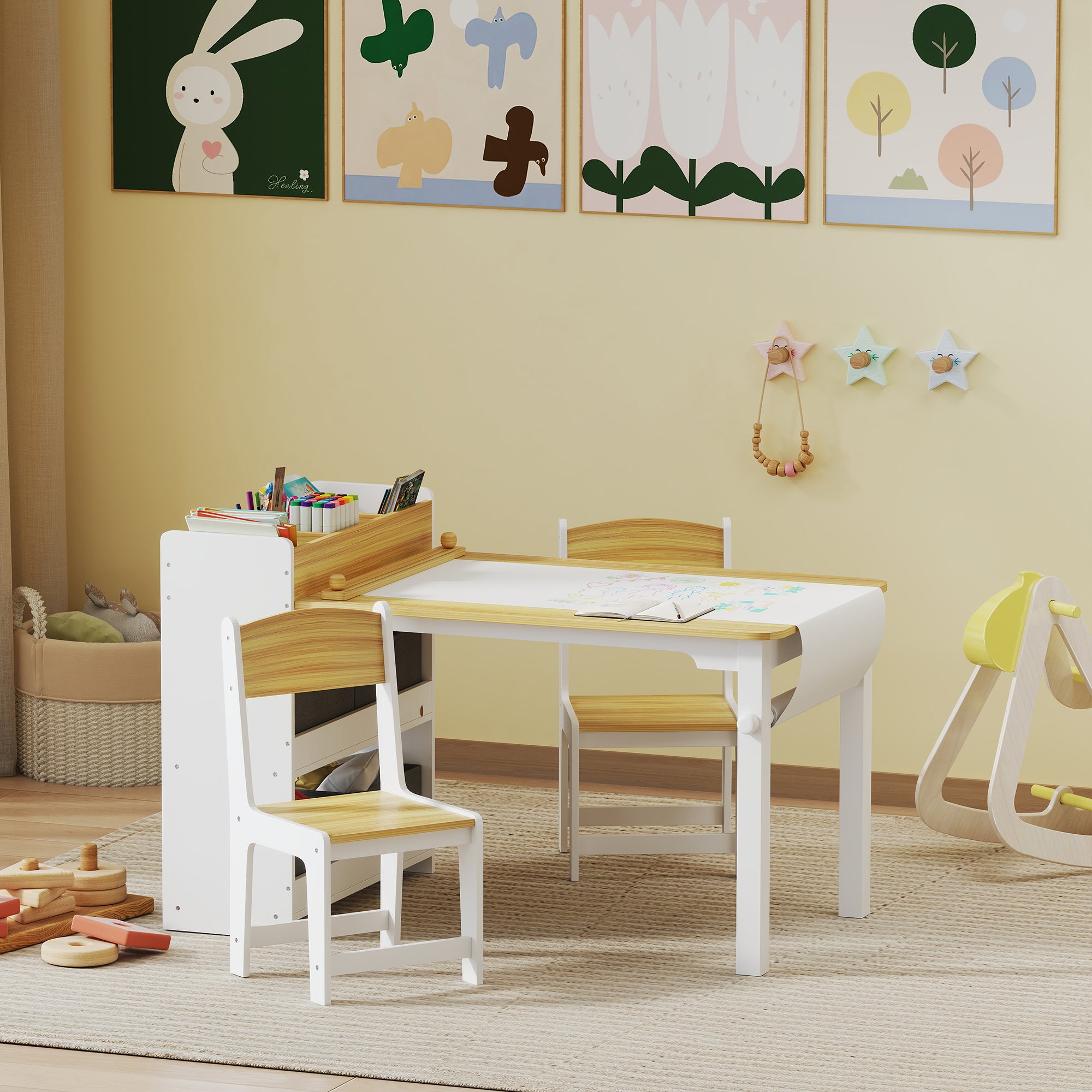 Functional and organized storage: Equipped with shelves, compartments, and fabric drawers, the table offers ample space to keep pencils, notebooks, and toys neatly organized. Each element is designed to encourage children's independence while avoiding clutter.