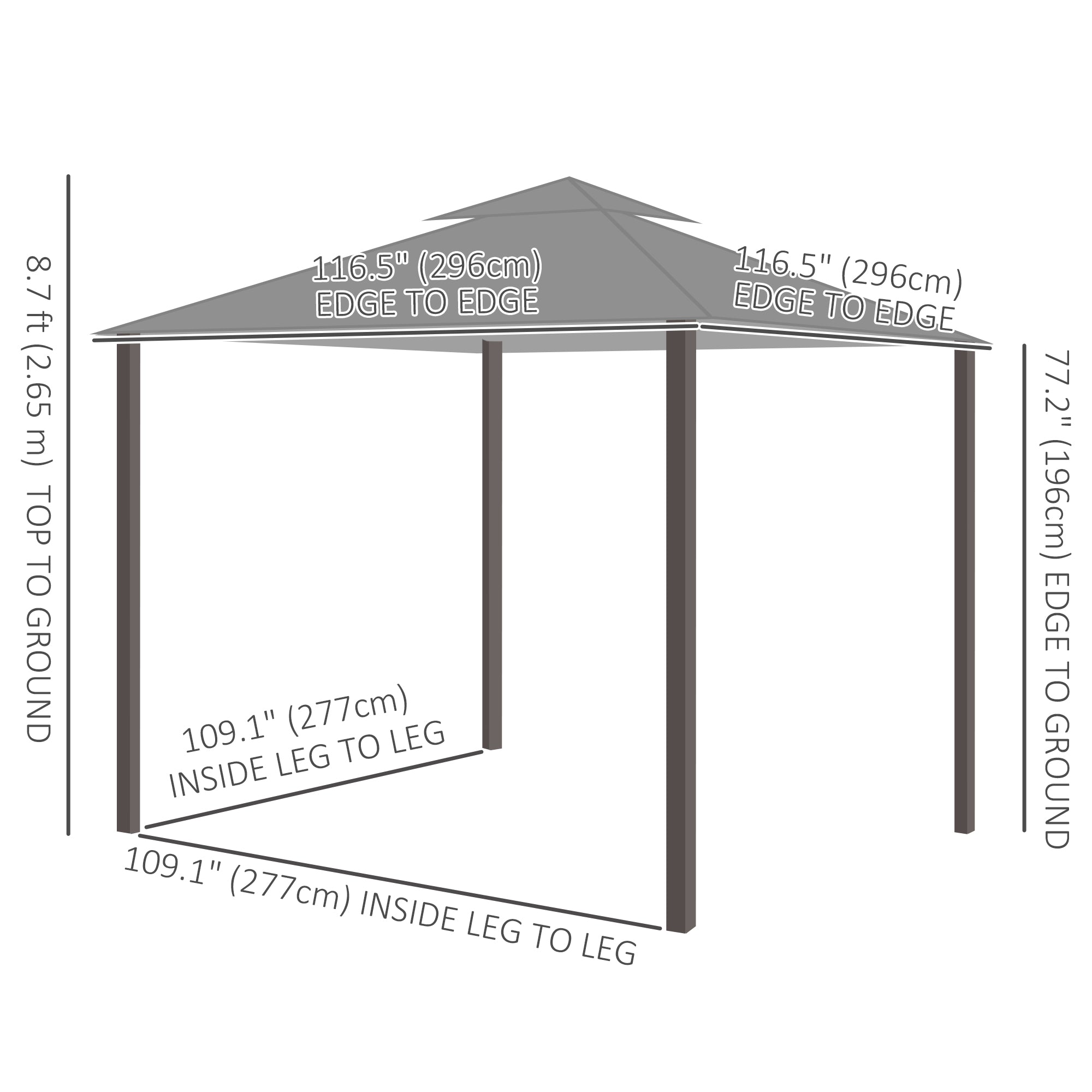 - • Overall Dimensions: 116.5" L x 116.5" W x 104.3" H (296 x 296 x 265 cm)