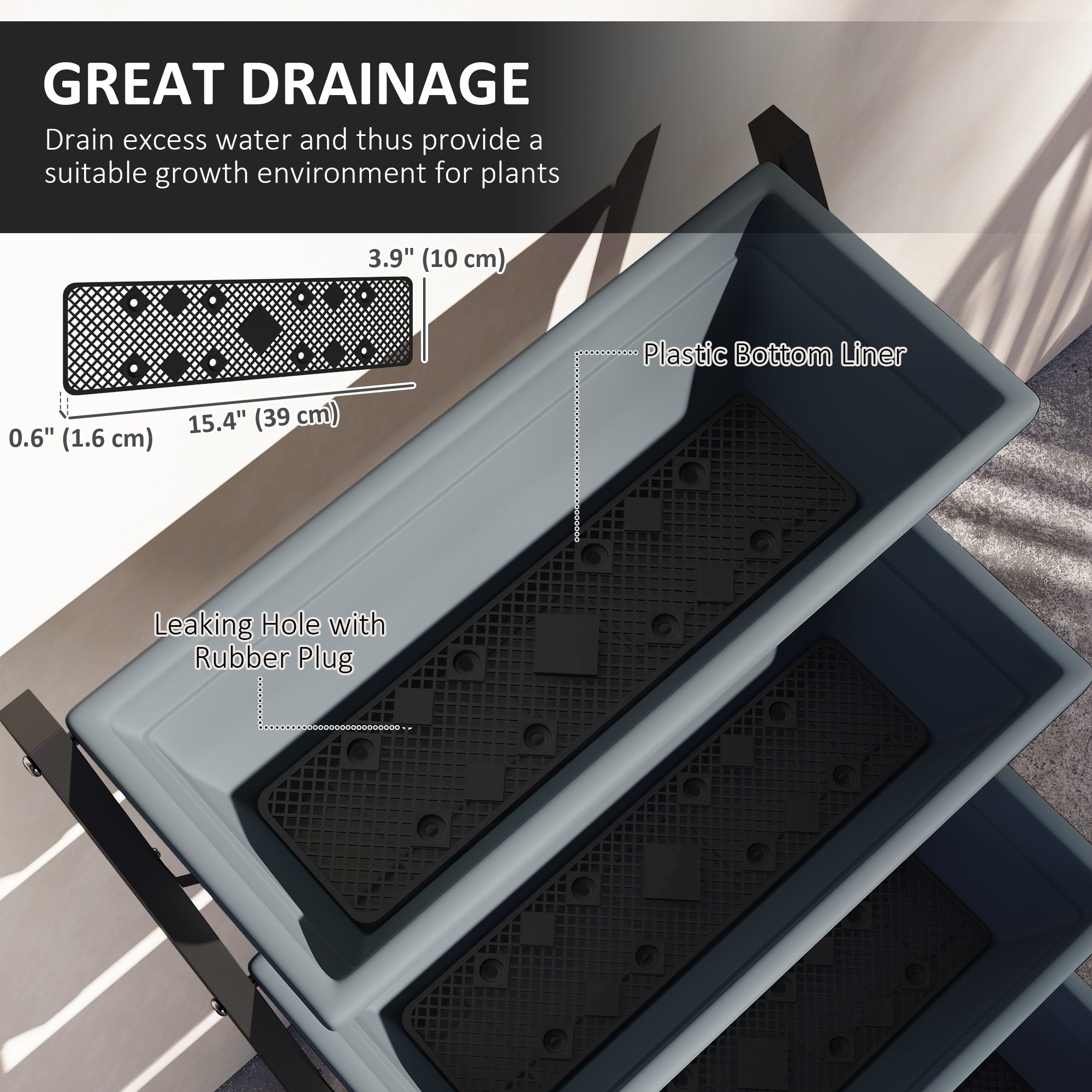 The steel frame ensures excellent outdoor stability, while the durable plastic trays retain their strength over time. Drainage holes with rubber stoppers promote efficient drainage for healthy plant growth.