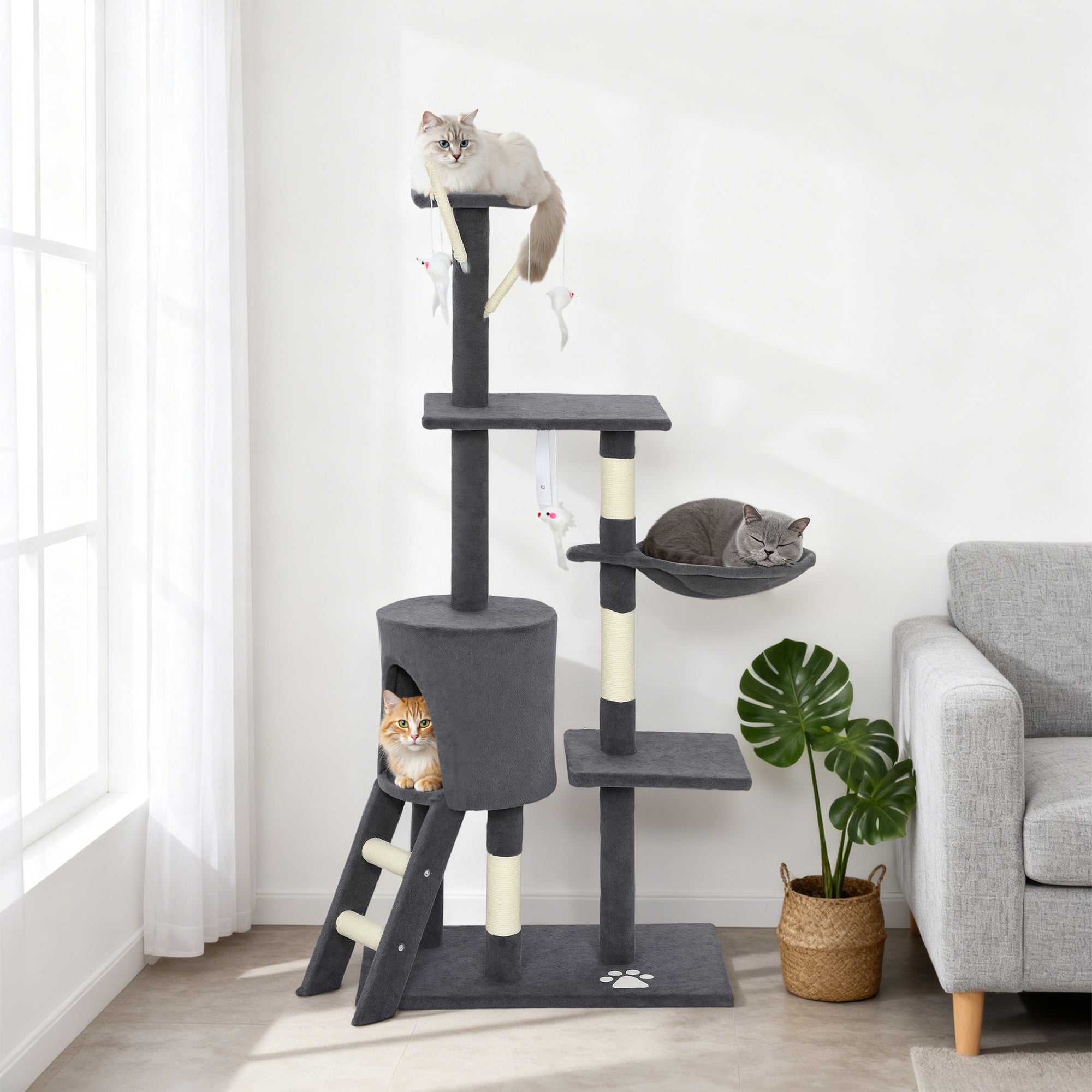 Designed as a true activity center, it includes an enclosed condo, platforms, a ladder, a hammock, and hanging toys. Your cat can climb, play, scratch, or relax as it pleases, promoting its physical and mental well-being.