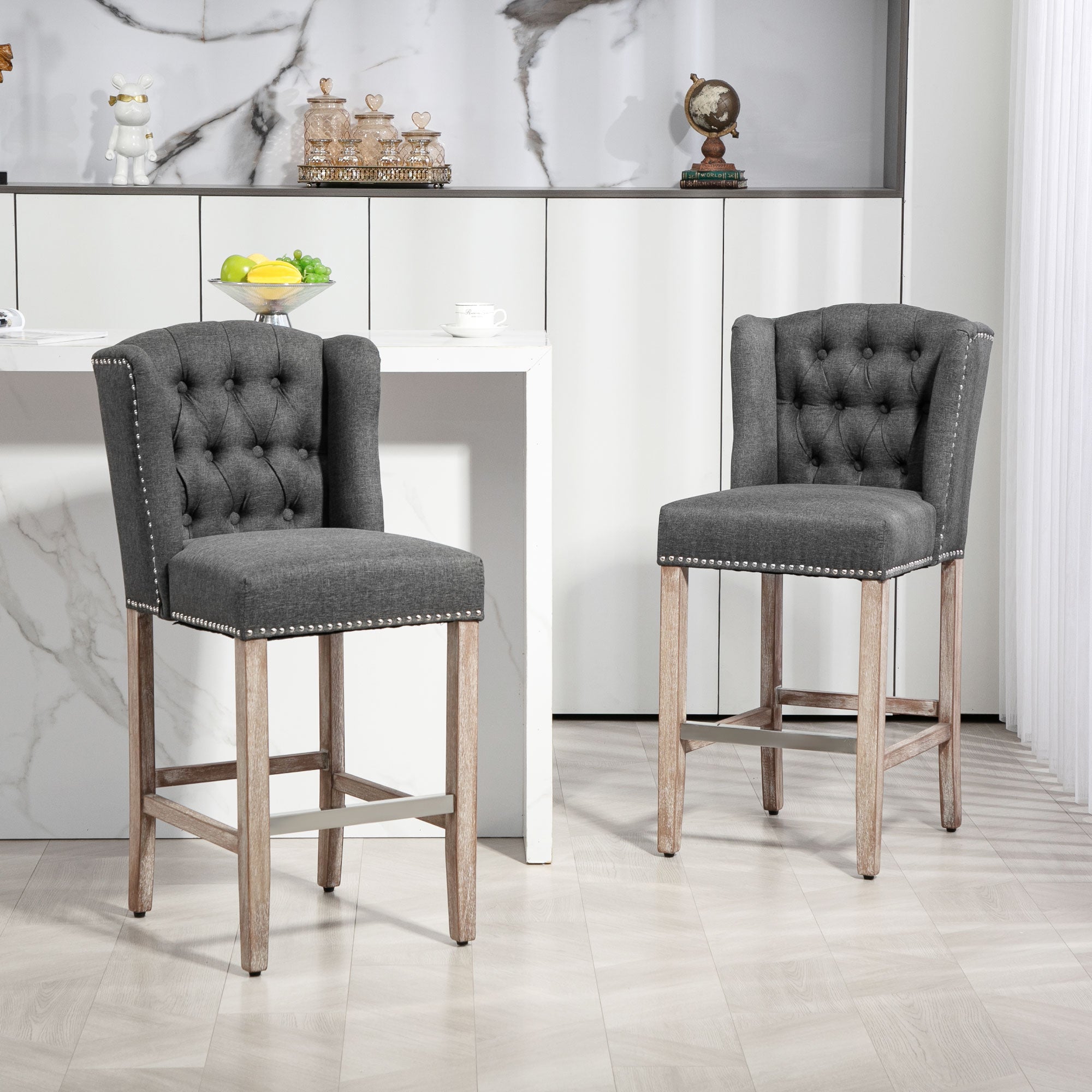 Comfort and style: These dark gray linen-look fabric stools bring a modern and elegant touch to your kitchen. Their wide, padded seat and high backrest offer optimal comfort for everyday use.