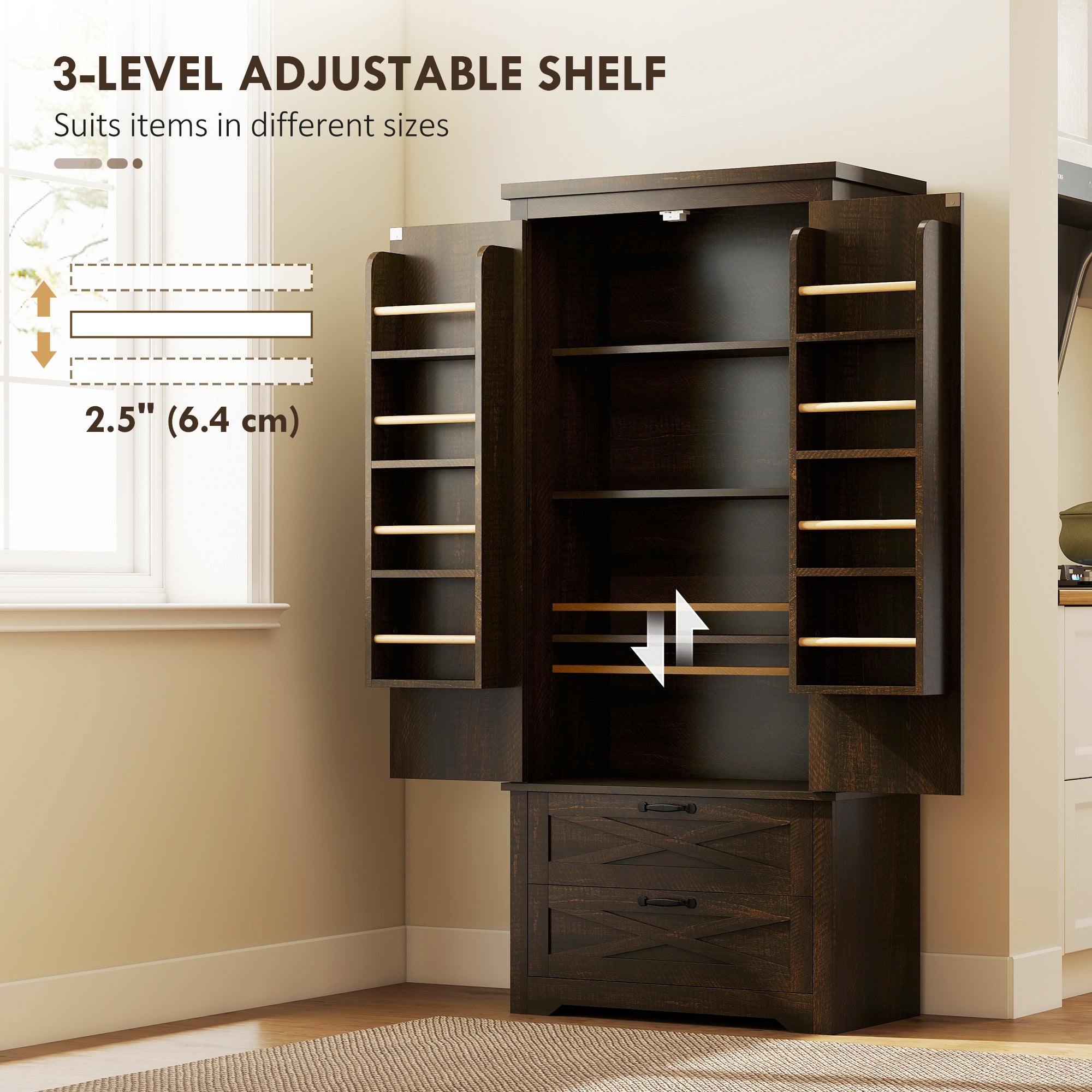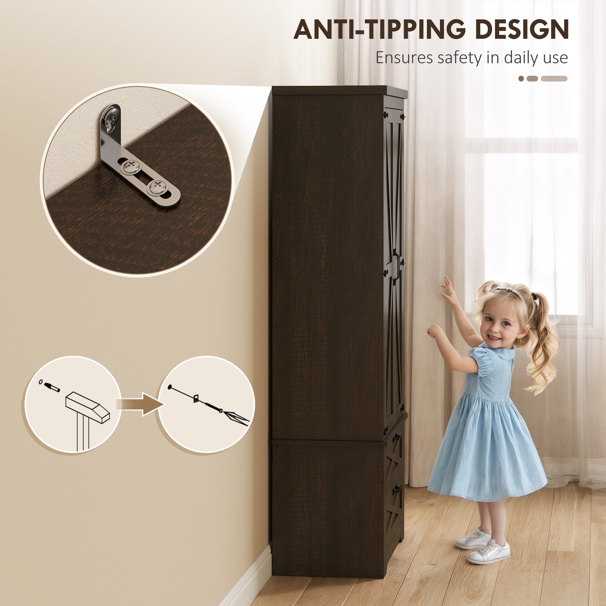 Distressed Brown Pantry - Barn Door Style Kitchen Cabinet with Drawers and Adjustable Shelves
