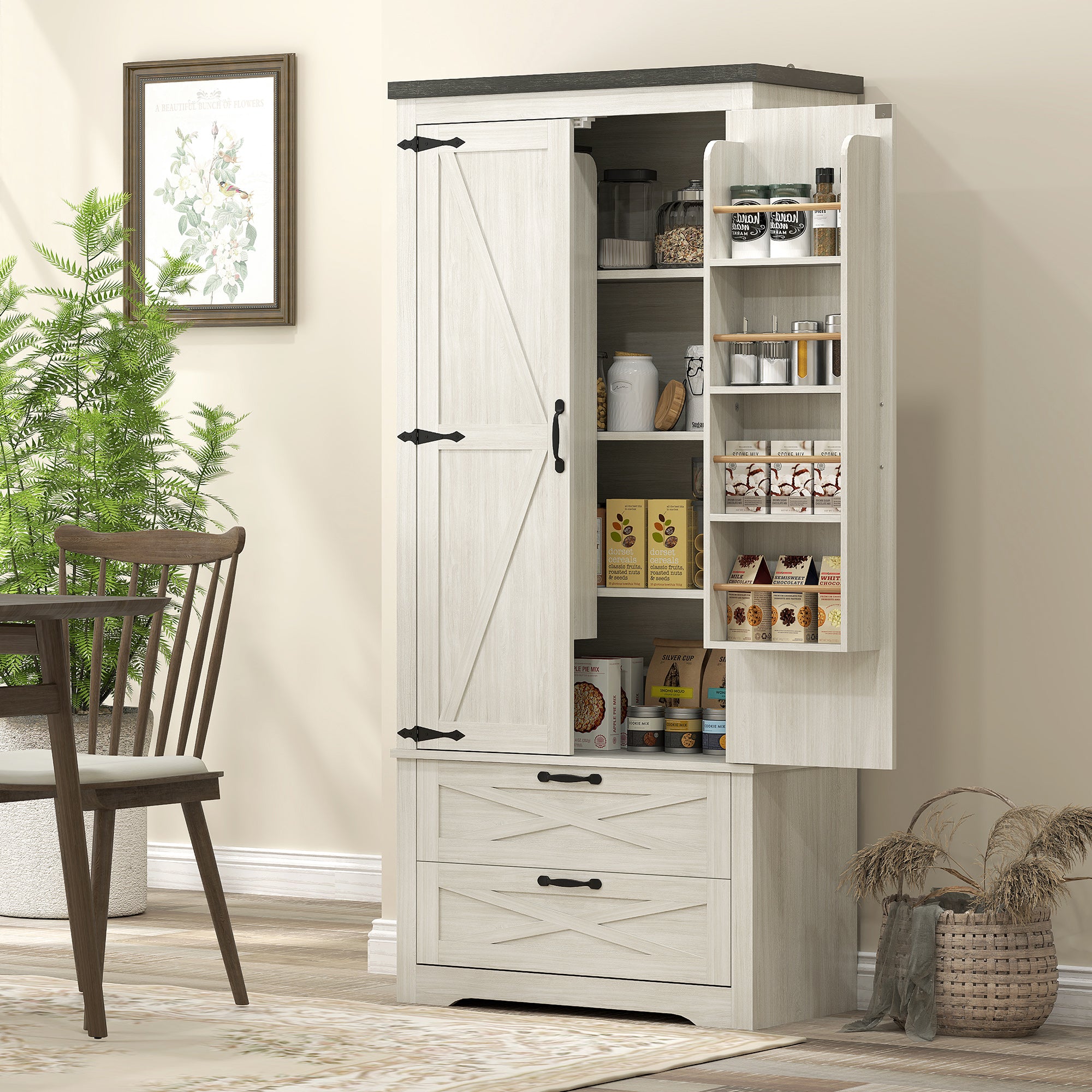 Distressed White Pantry - Barn Door Style Kitchen Cabinet with Drawers and Adjustable Shelves