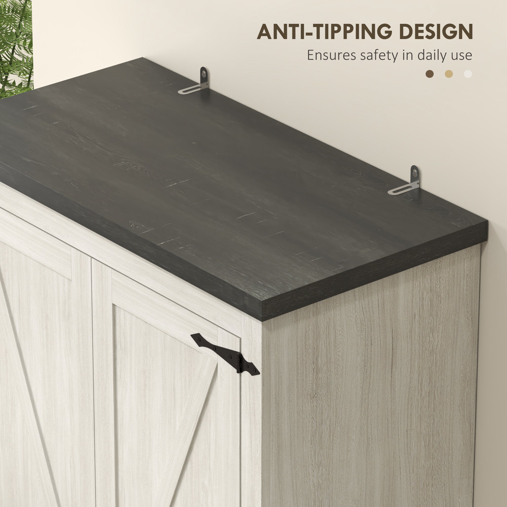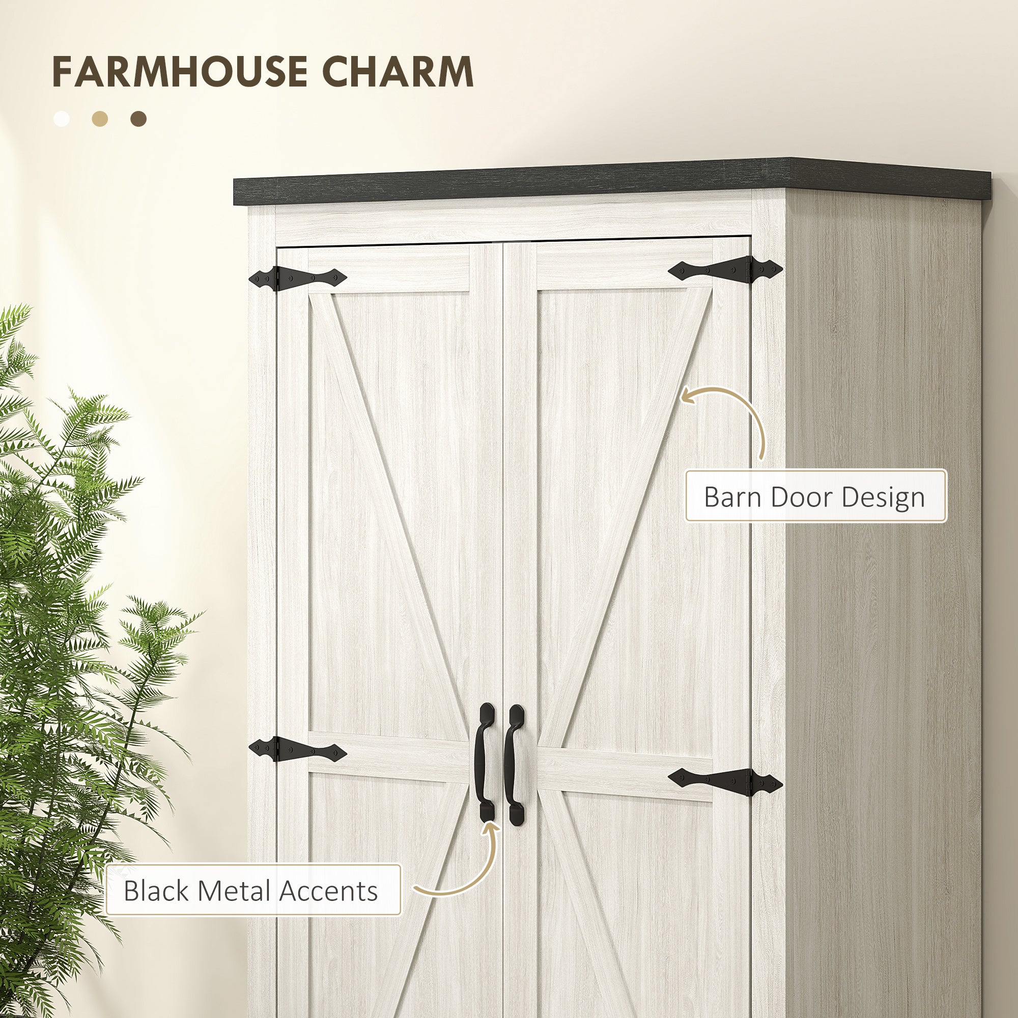 - Special Features: Aged white finish, black accent barn doors, adjustable shelves, smooth-gliding drawers, magnetic doors, modern rustic design, anti-tip system