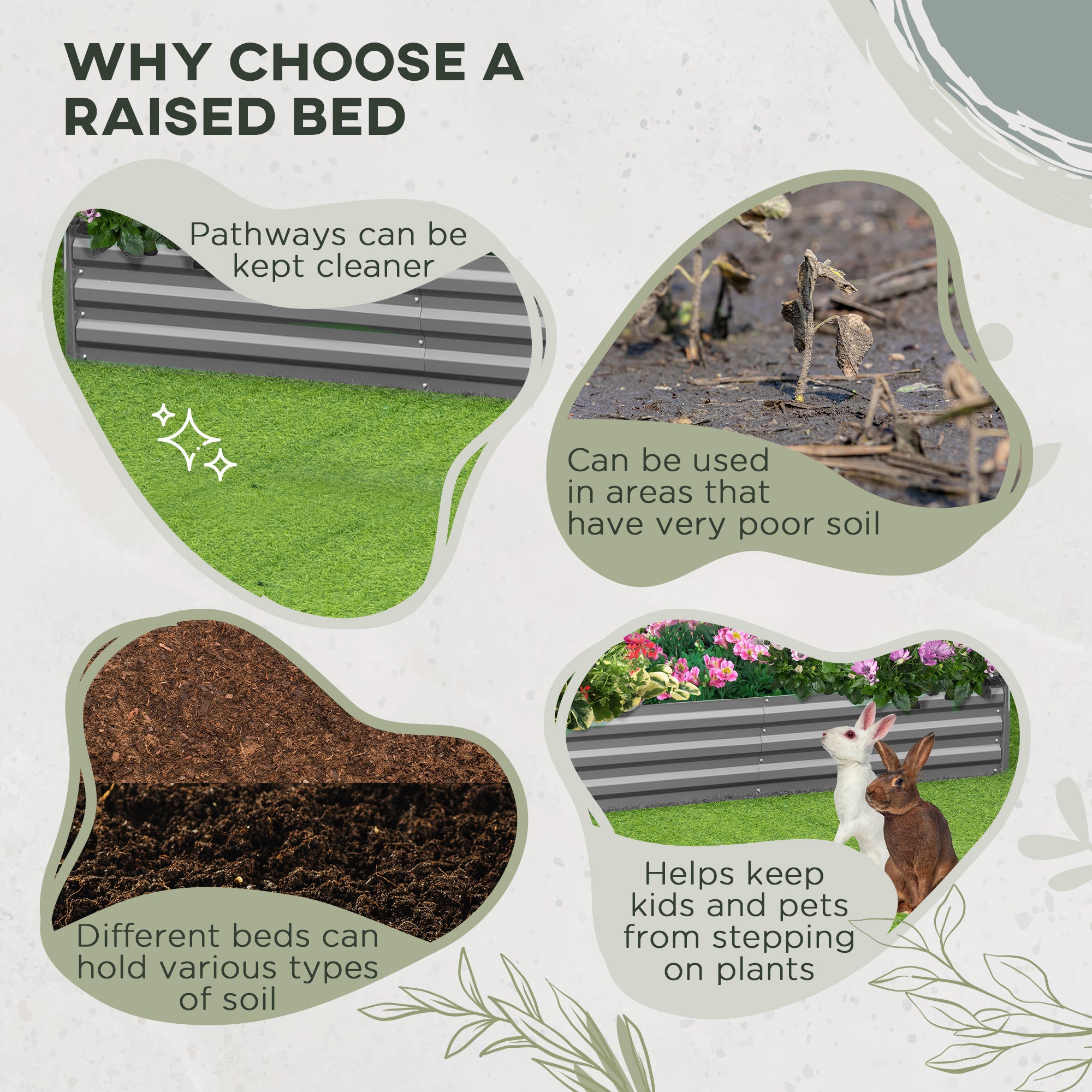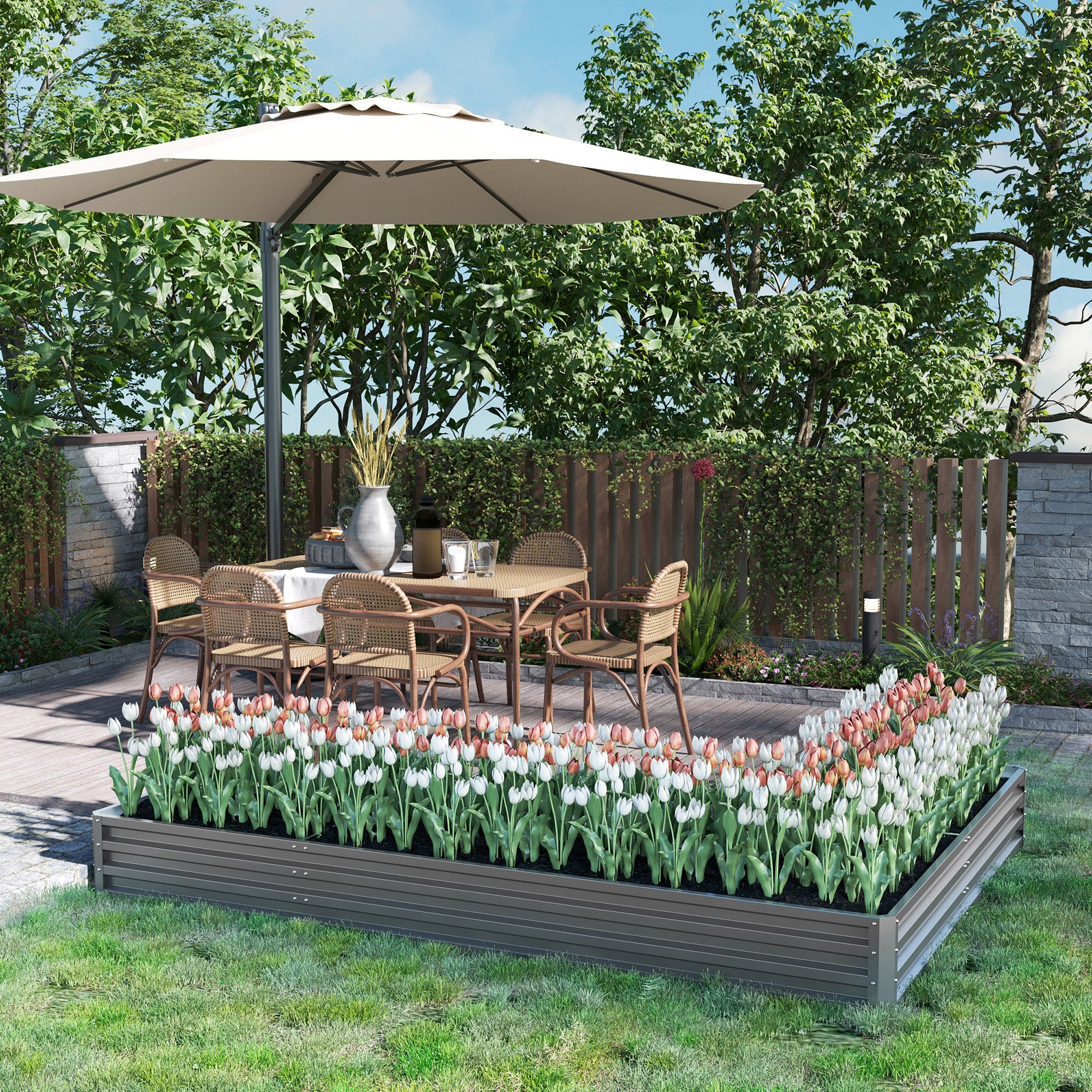Thanks to its bottomless design, this raised bed can be placed directly on the ground, allowing the roots to spread naturally deep into the soil. It is ideal for growing flowers, vegetables, and herbs, while also promoting efficient drainage and good soil aeration.