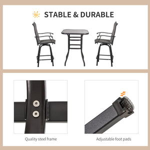 - 3-piece patio bar set: two swivel stools and a high table with a tempered glass top. Ideal for a relaxing solo break or a friendly moment with friends in the sun.