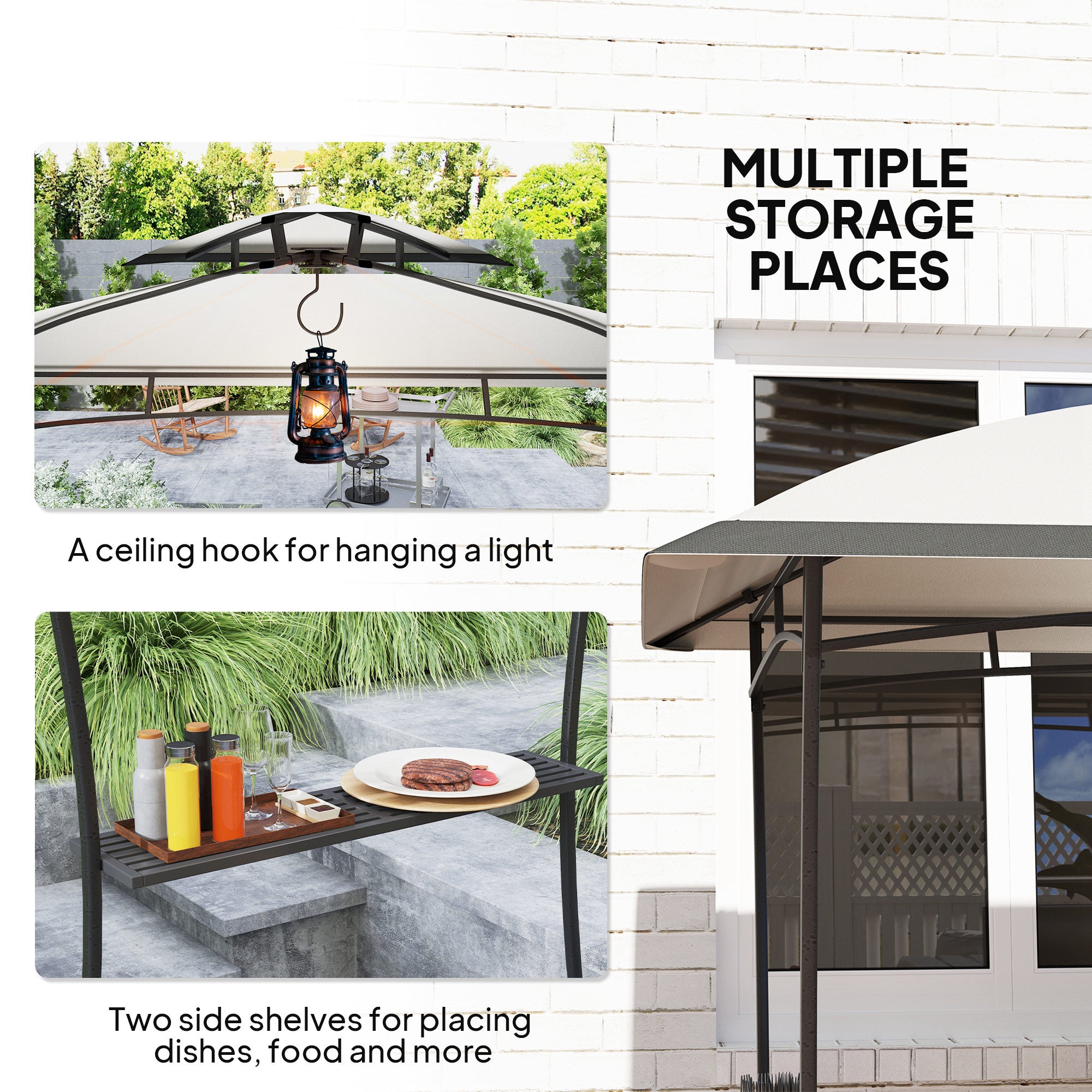 - Convenient Storage Options: Equipped with a shelf on each side, this bbq shelter offers ample space for condiments, cutlery, and food, plus a hook on the canopy top for hanging a light