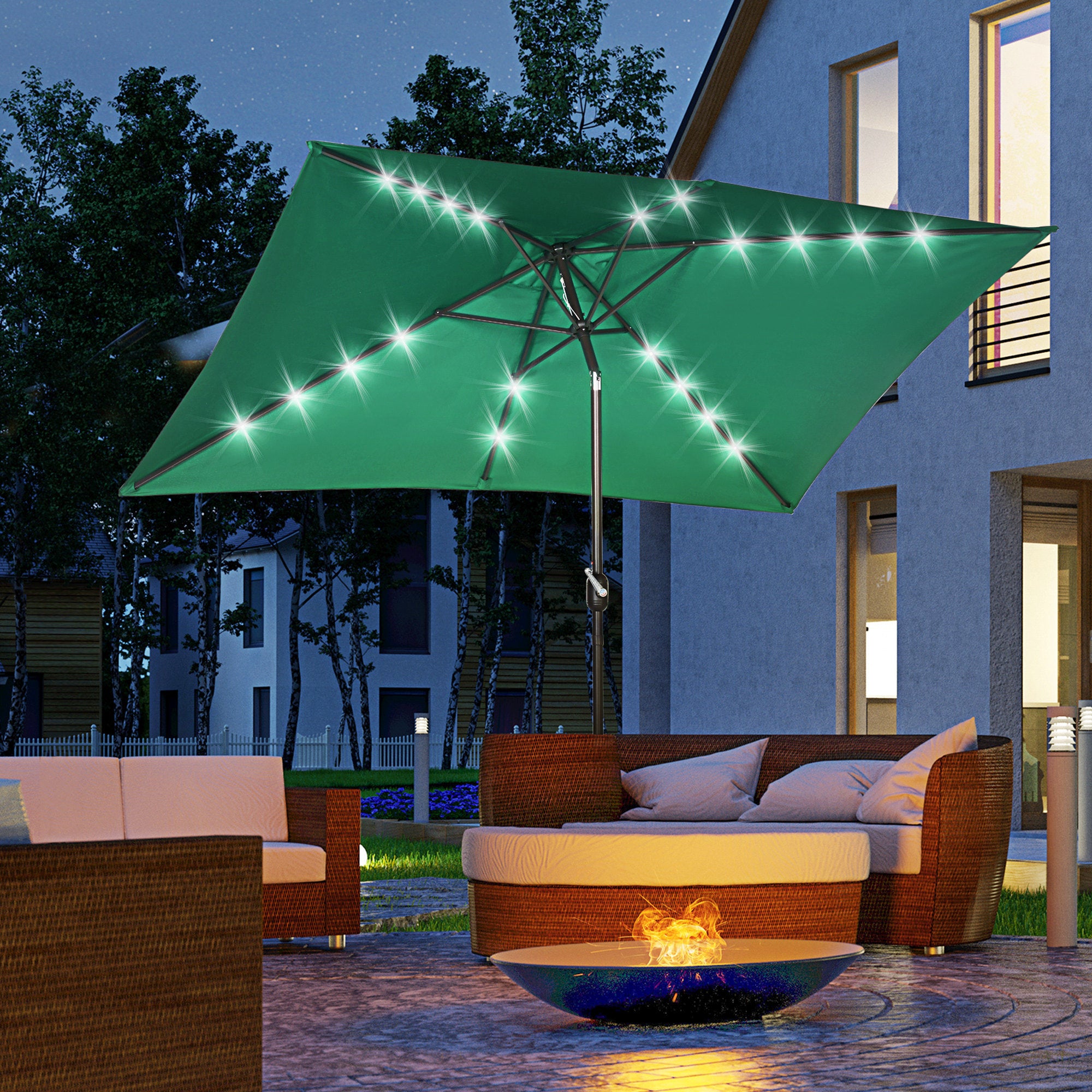 This 9.7-foot rectangular solar-powered umbrella is perfect for enjoying both sunny days and starry nights. It provides effective UV protection while creating a warm ambiance thanks to its 20 integrated solar LEDs. Its elegant dark green design with a dark brown pole blends seamlessly into any outdoor space.