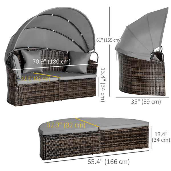 - Outdoor Daybed Information: Overall Dimensions: 171 x 180 x 155 cm (W x D x H) (canopy unfolded) and 171 x 180 x 78 cm (W x D x H). Capacity: 180 kg (per seat). Assembly required.