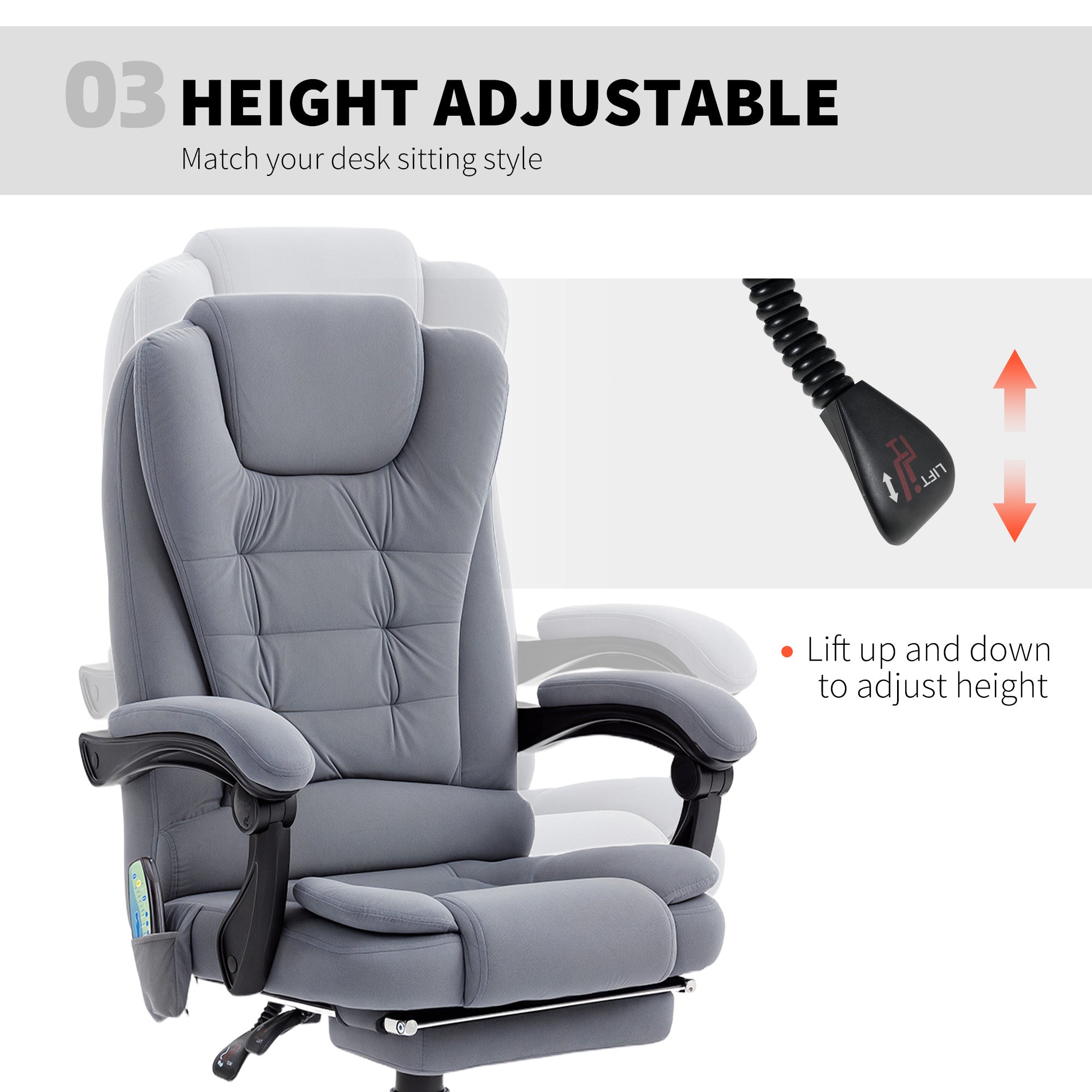 Comfort and design: Enjoy a stylish armchair that combines comfort and sophistication. Its soft-to-the-touch, velvety gray upholstery adds a modern and calming touch to your office. The ergonomic backrest, plush seat, and integrated footrest ensure perfect support for your back and legs, even during long workdays.