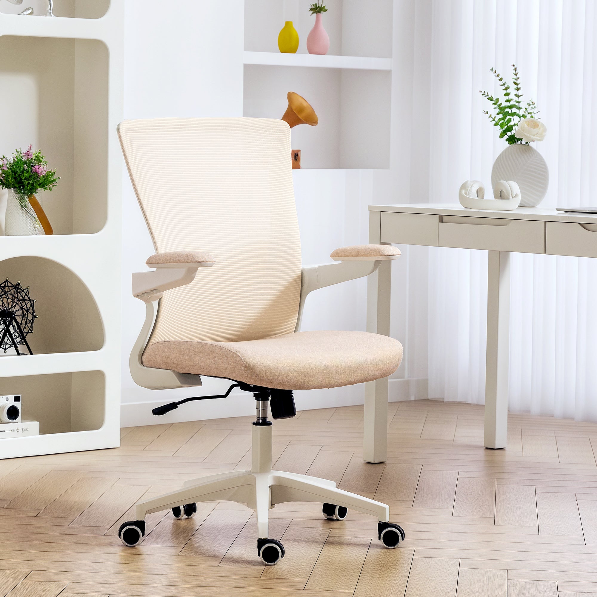 Ergonomic office chair with lumbar support and flip-up armrests – Beige and white