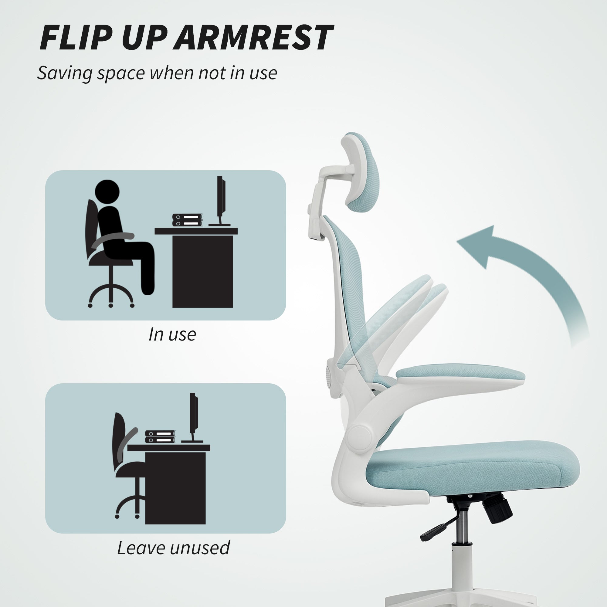 Versatile use: Suitable for both office and home use, this chair offers excellent ergonomics. The flip-up armrests allow for easy storage under a desk, freeing up space. Its 360° swivel and quiet PU casters make it easy to move without damaging your floor.