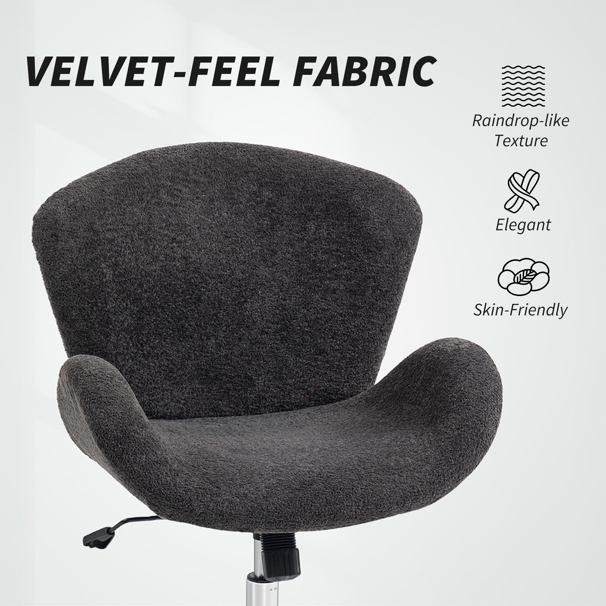 Comfort and design: Enhance your workspace with this dark gray velvet office chair, combining elegance and well-being. Its butterfly back and curved seat perfectly conform to the body's shape for enveloping comfort. The soft, luxurious velvet adds a touch of modern sophistication, while its raindrop-inspired texture creates a refined and soothing visual effect.