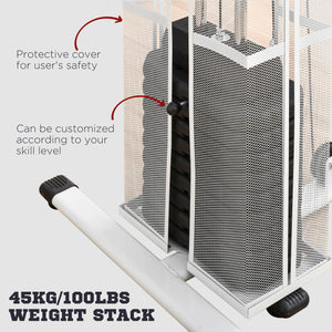 - Multifunctional Design: Includes a 10 x 10 lb weight stack that can be customized to your fitness level. This home gym equipment allows for various exercises like lat pulldown, butterfly, lower pulldown, arm curl, and kicks.