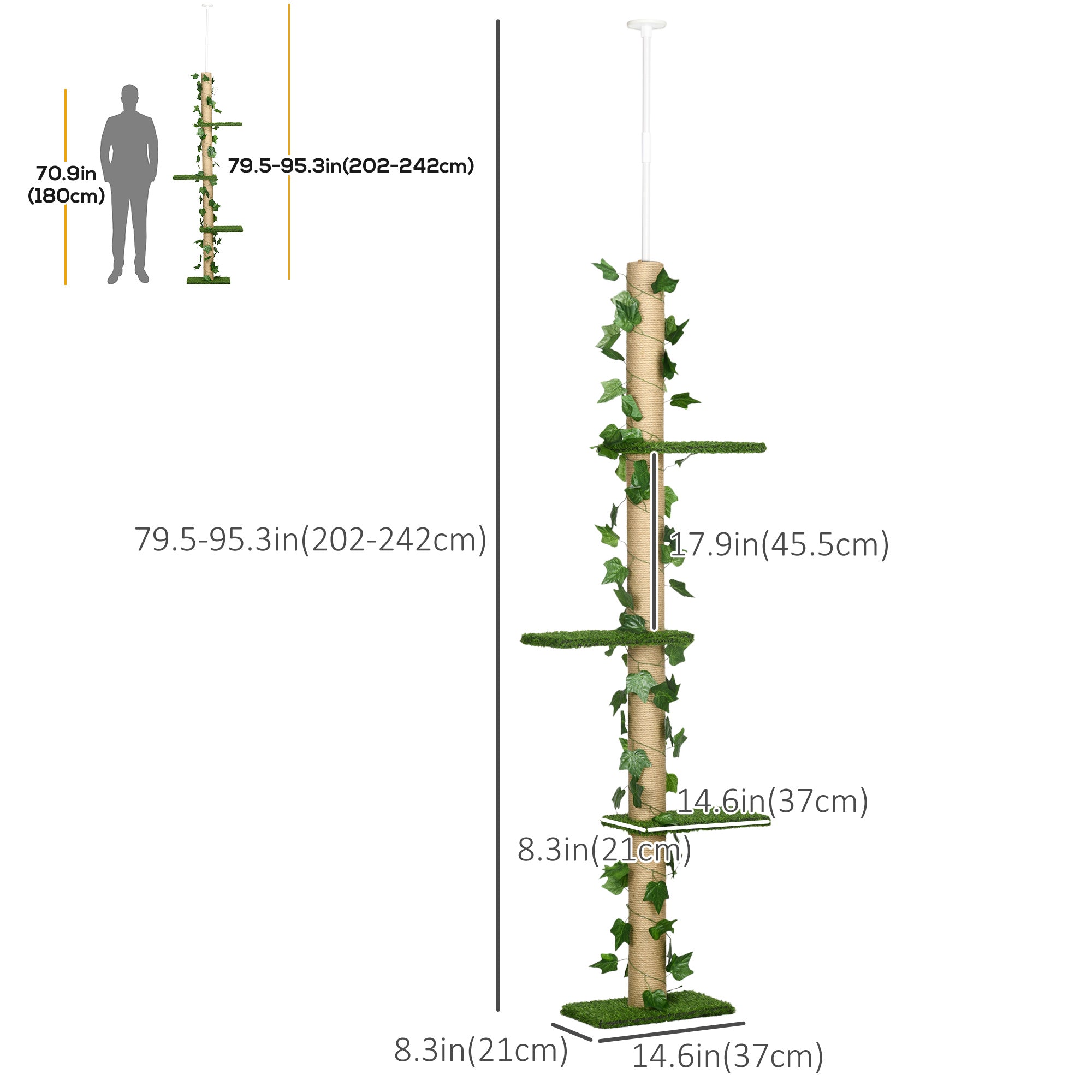 Comfort and design: Give your feline a unique space for relaxation and adventure with this nature-inspired cat tree. Its vertical floor-to-ceiling design, embellished with artificial leaves and decorative vines, transforms your home into a veritable exploration garden for cats.