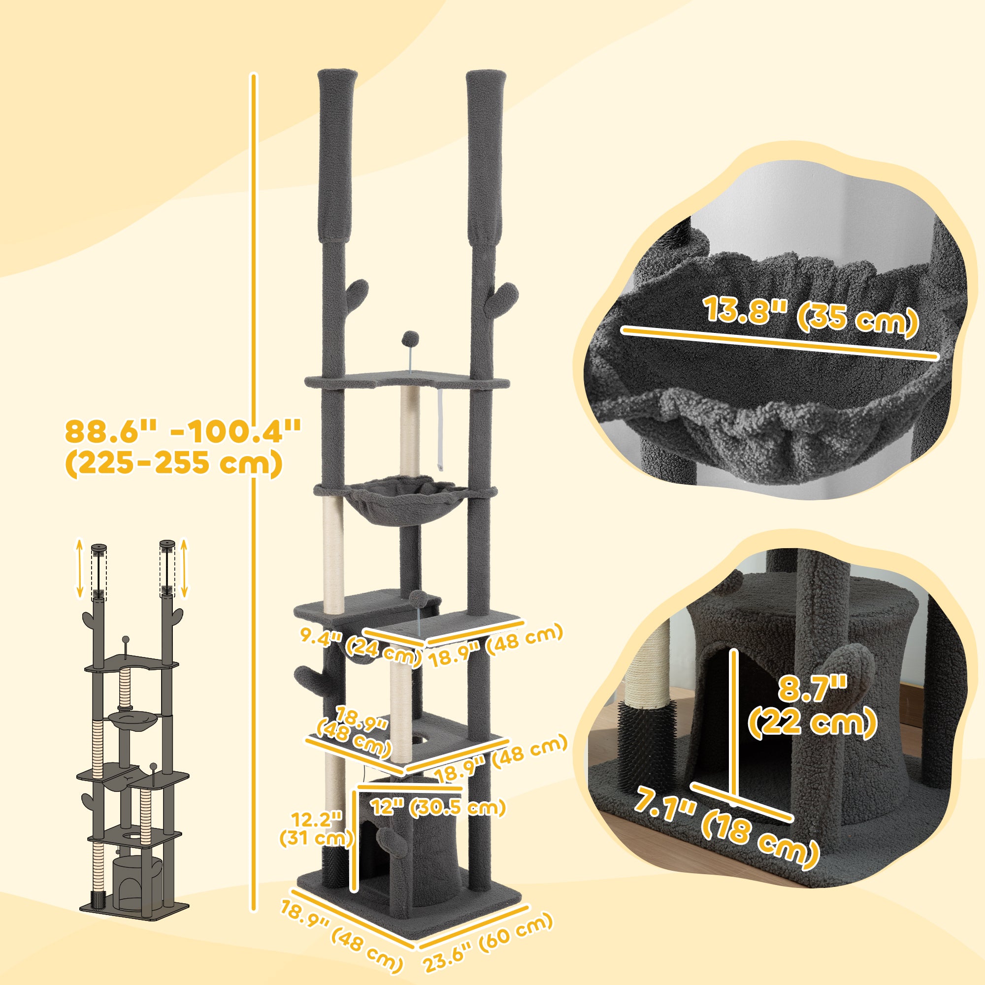 Grey Floor-to-Ceiling Cat Tree: Adjustable Tower with Hammocks and Plush Condo