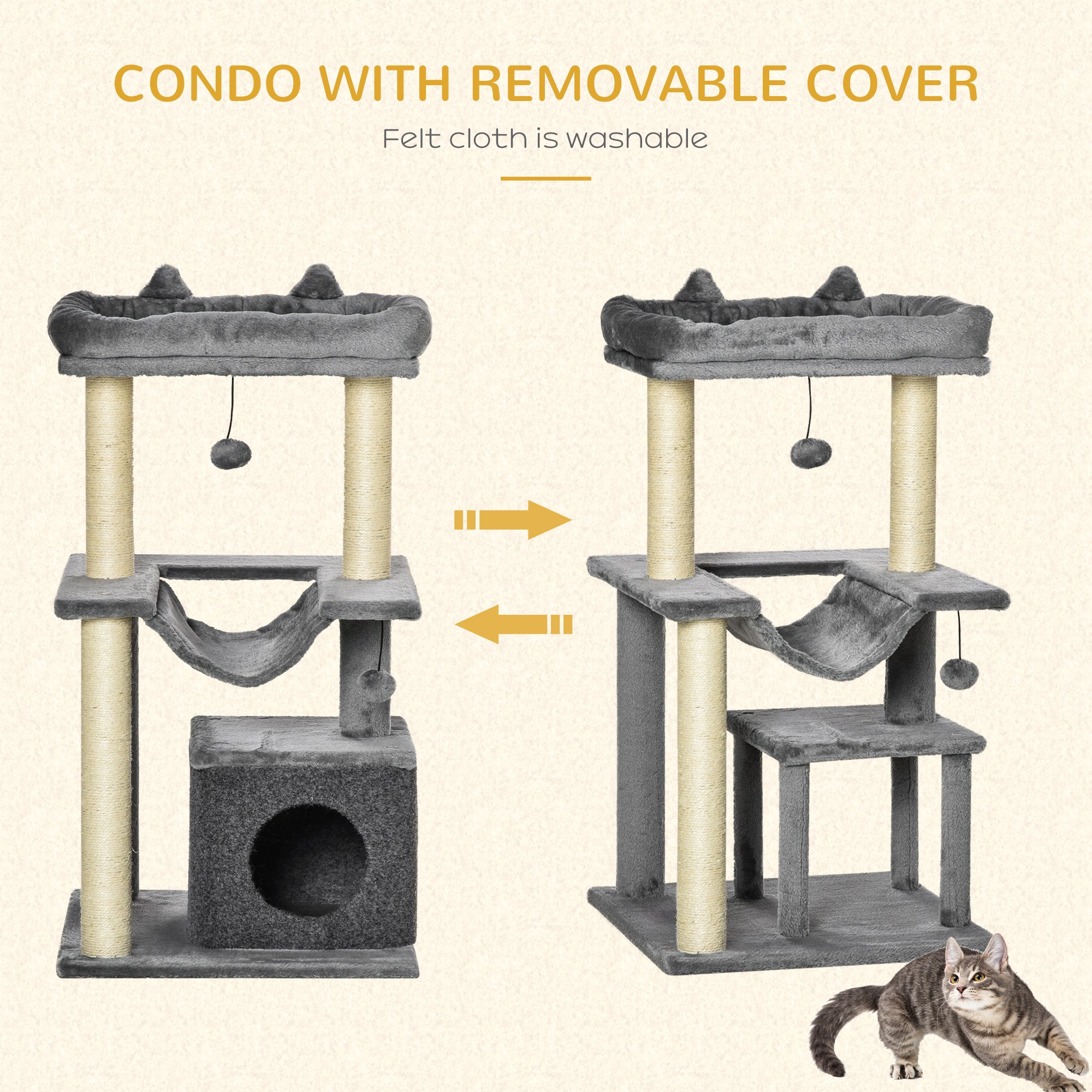 Grey Cat Tree - Complete with Scratching Posts, Cabin, Hammock, Perch and Hanging Toys