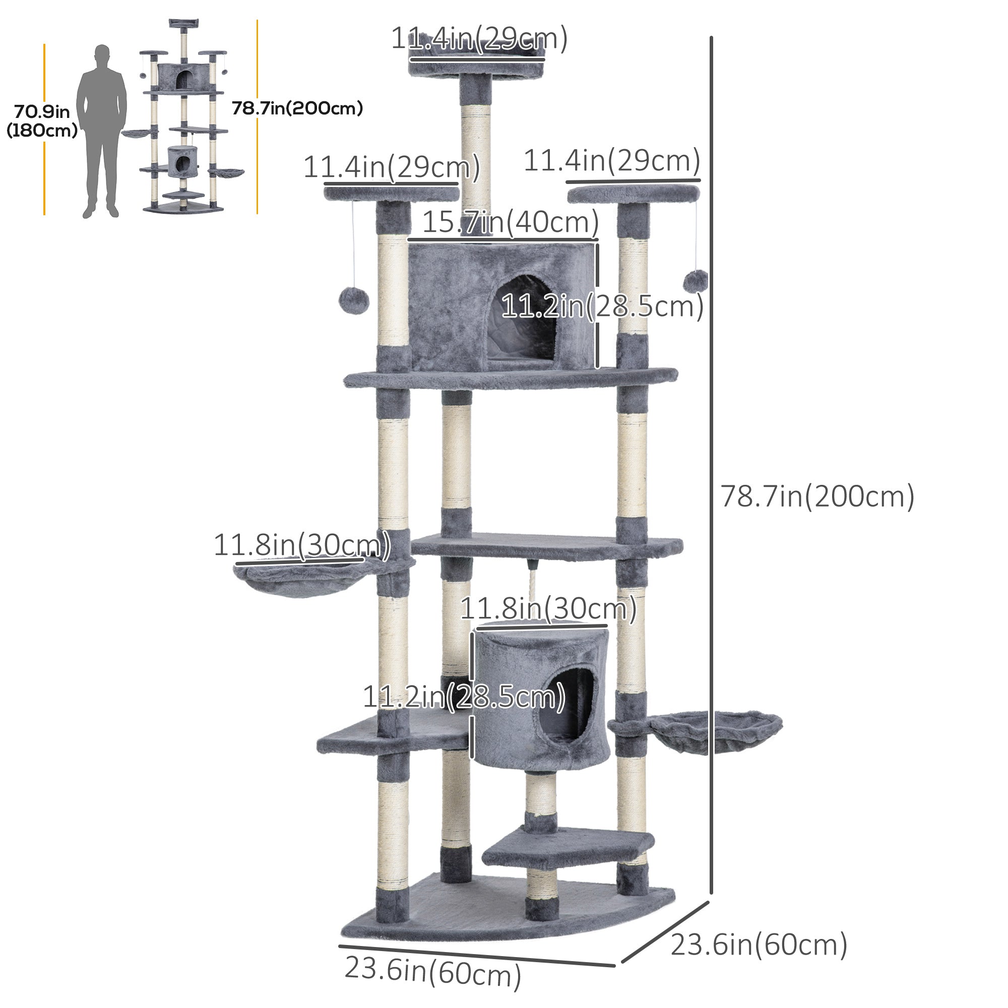 Versatile Use: This spacious tree includes cabins, perches, a hammock, beds, and several toys to keep your cats entertained throughout the day. Two hanging balls and a teasing rope stimulate their hunting instincts, while the different heights encourage climbing and physical exercise.