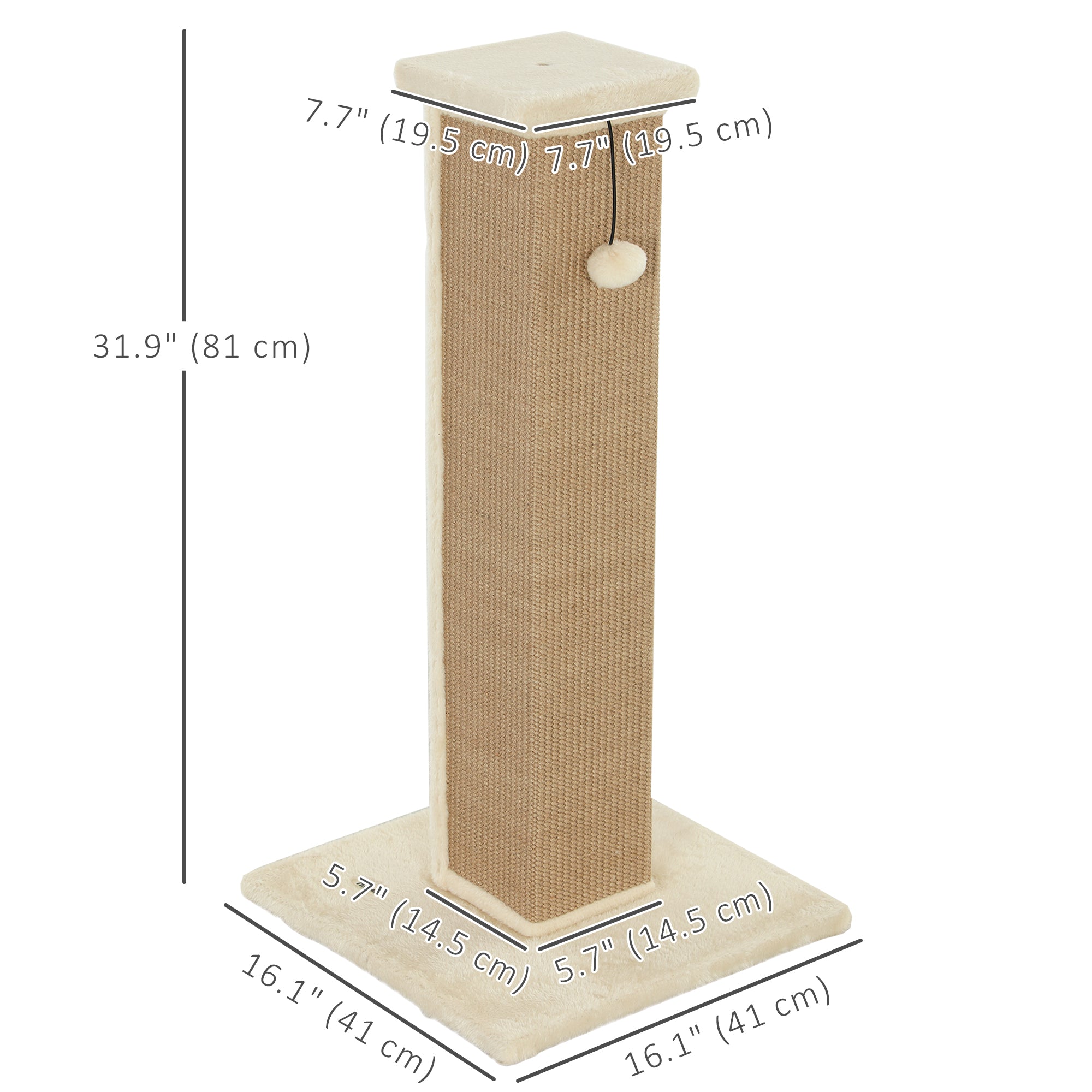 - Scratching post: 14.5 x 14.5 x 76 cm (5.7" L x 5.7" W x 29.9" H)