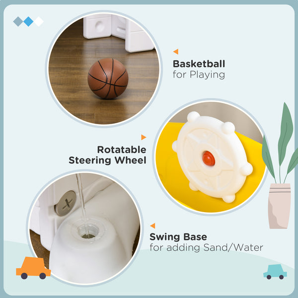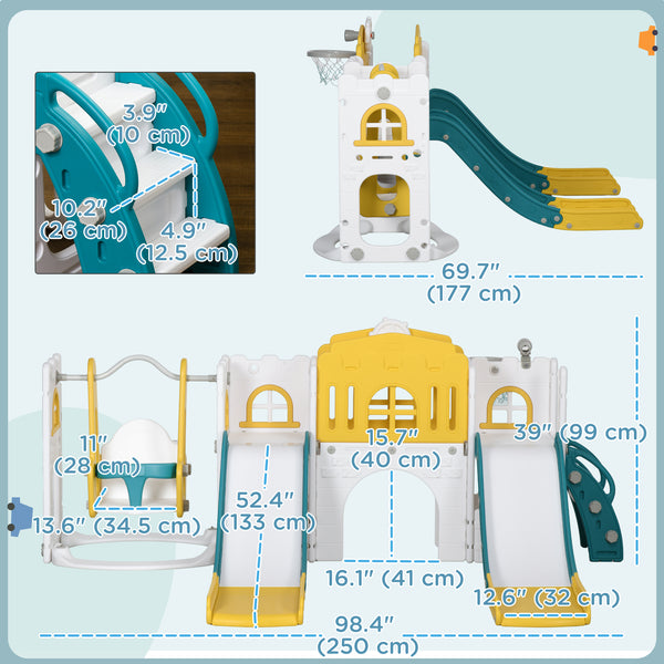 - Contains: 1 complete swing and slide set, 1 basketball, 1 inflator, 1 manual