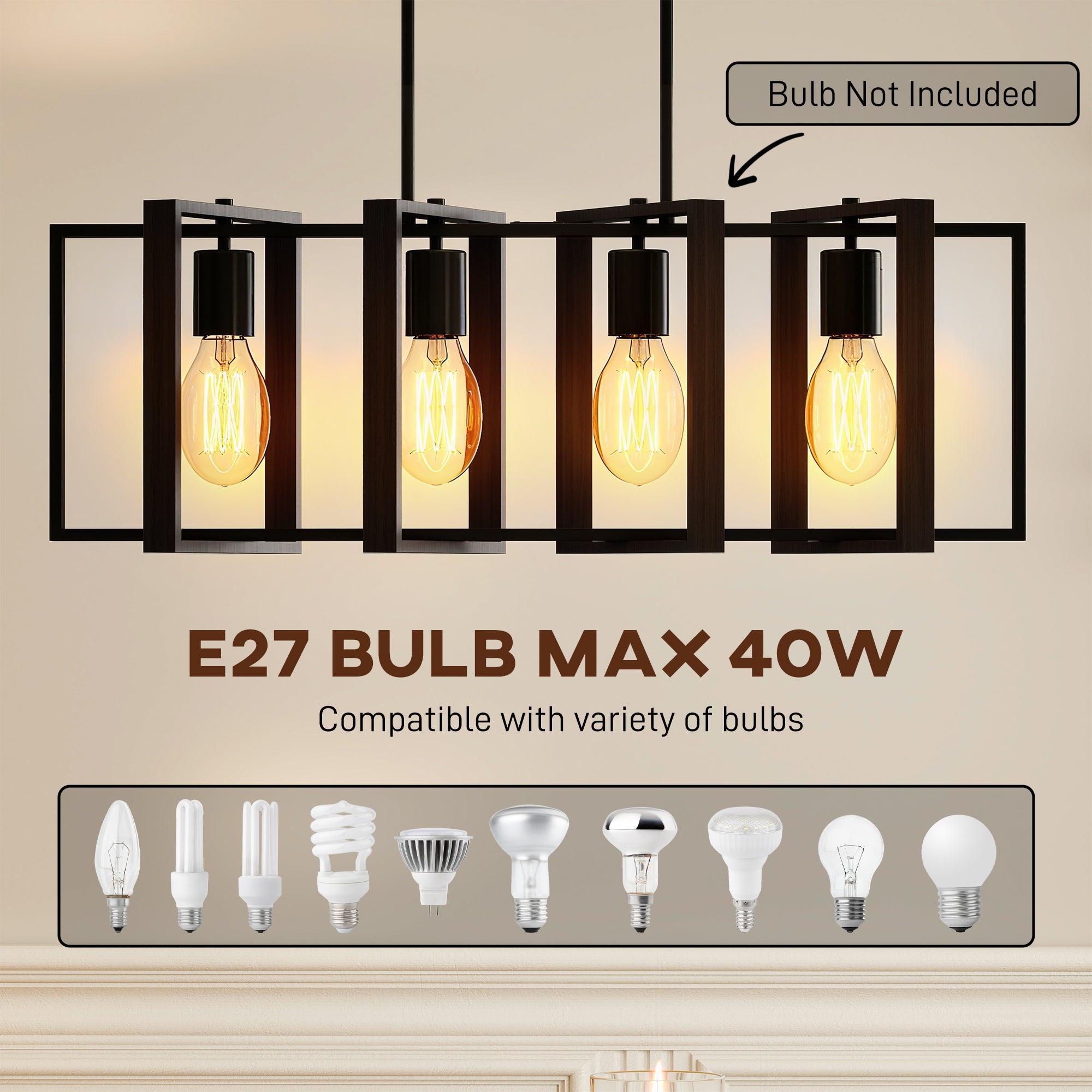- • Socket: 4 x E26 (bulbs not included), max 40W per socket, max bulb size G80