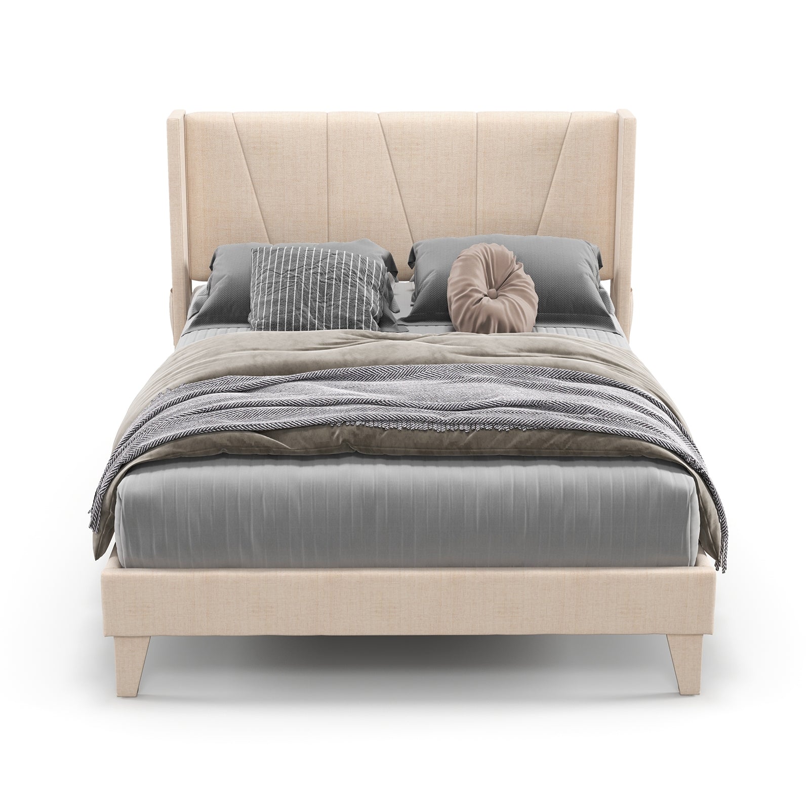 Upholstered platform bed with ergonomic headboard and integrated storage