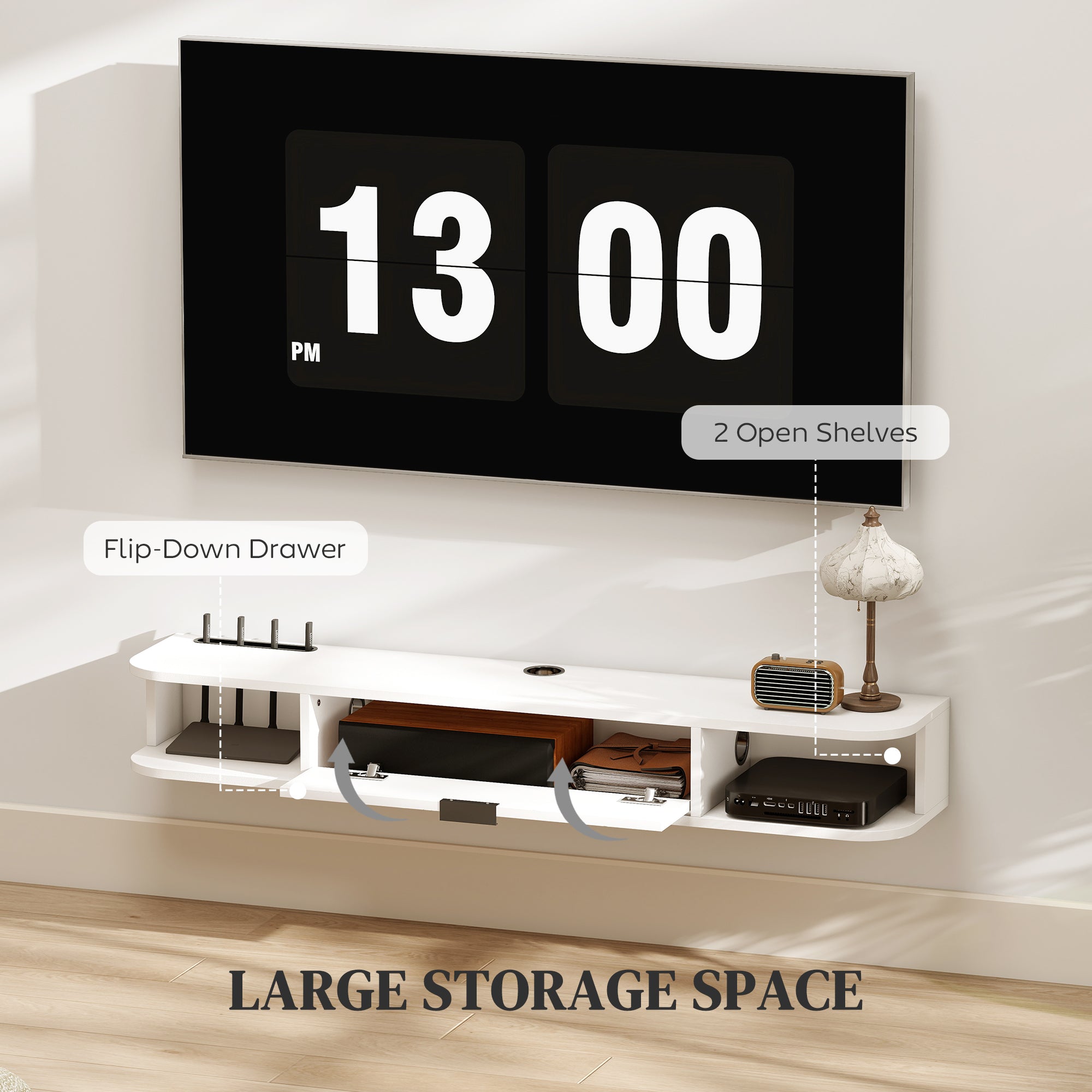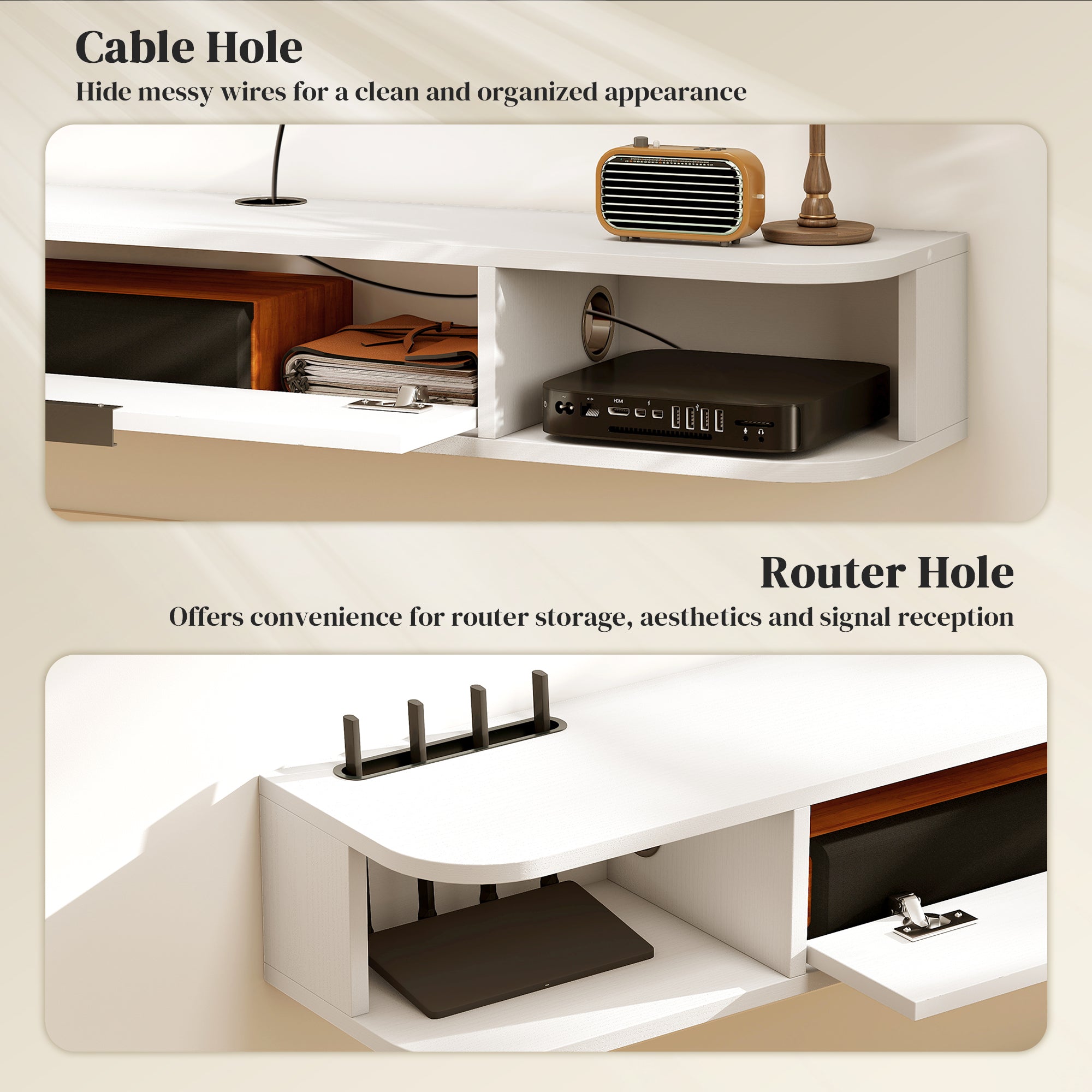 White Wood Grain Wall Mounted TV Stand - Compact Wall Mount with Drop-Down Drawer and Open Shelves
